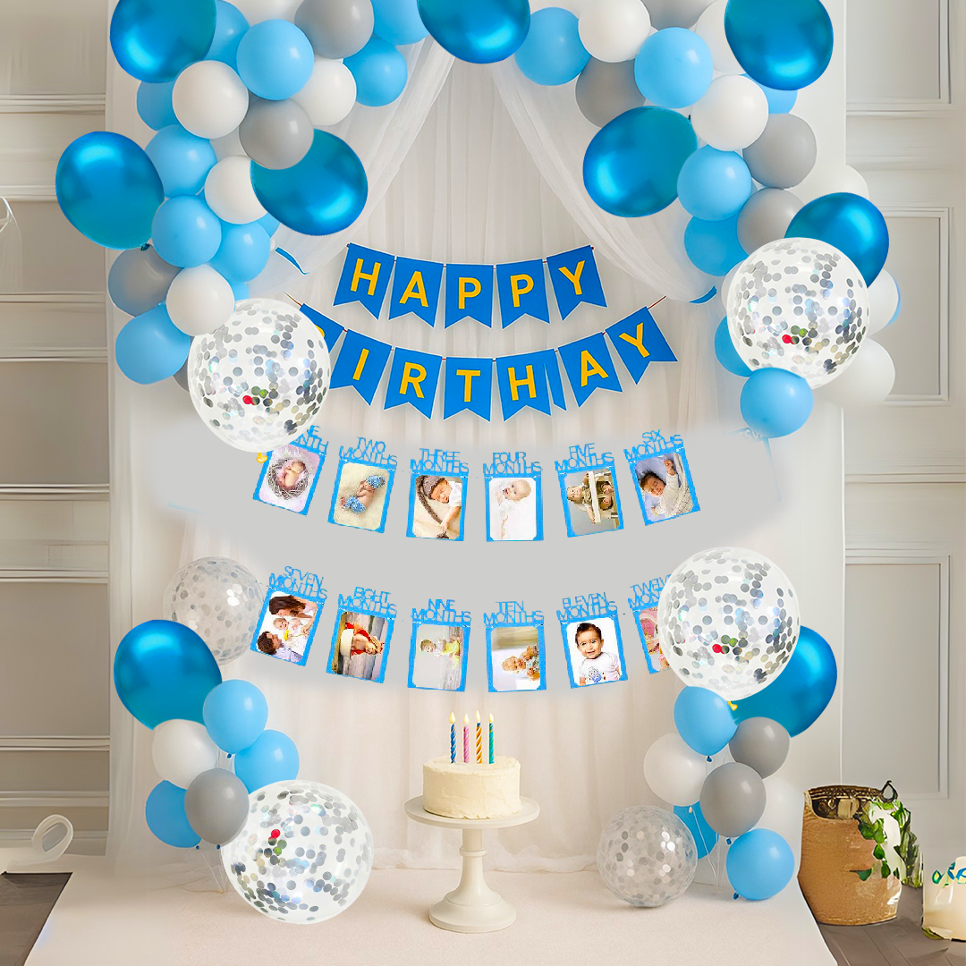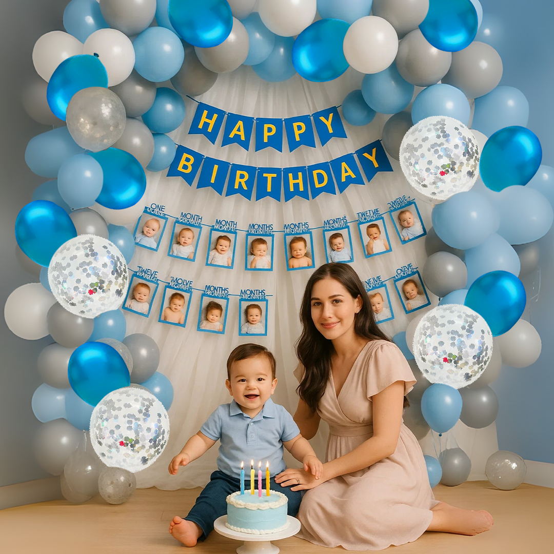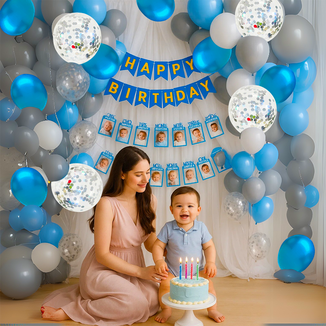 All-in-One Kit: Celebrate your baby boy’s special day with this 70-piece decoration set, featuring a “Happy Birthday” banner, LED lights, photo hanging garland, 62 balloons, confetti balloons, cake candles, and decor accessories — everything you need in one pack!
