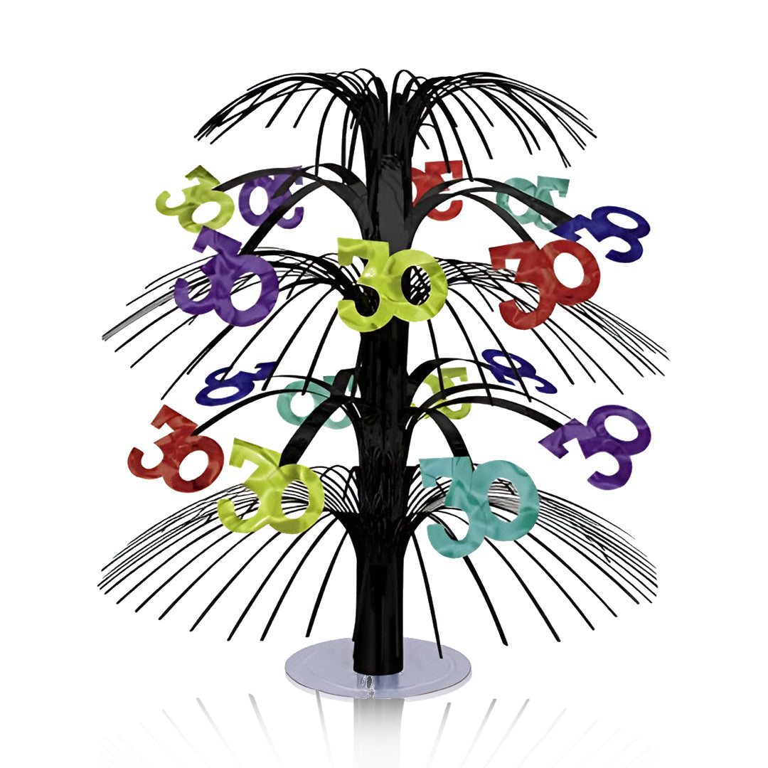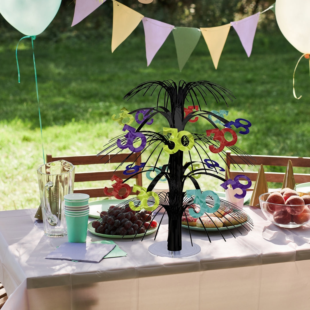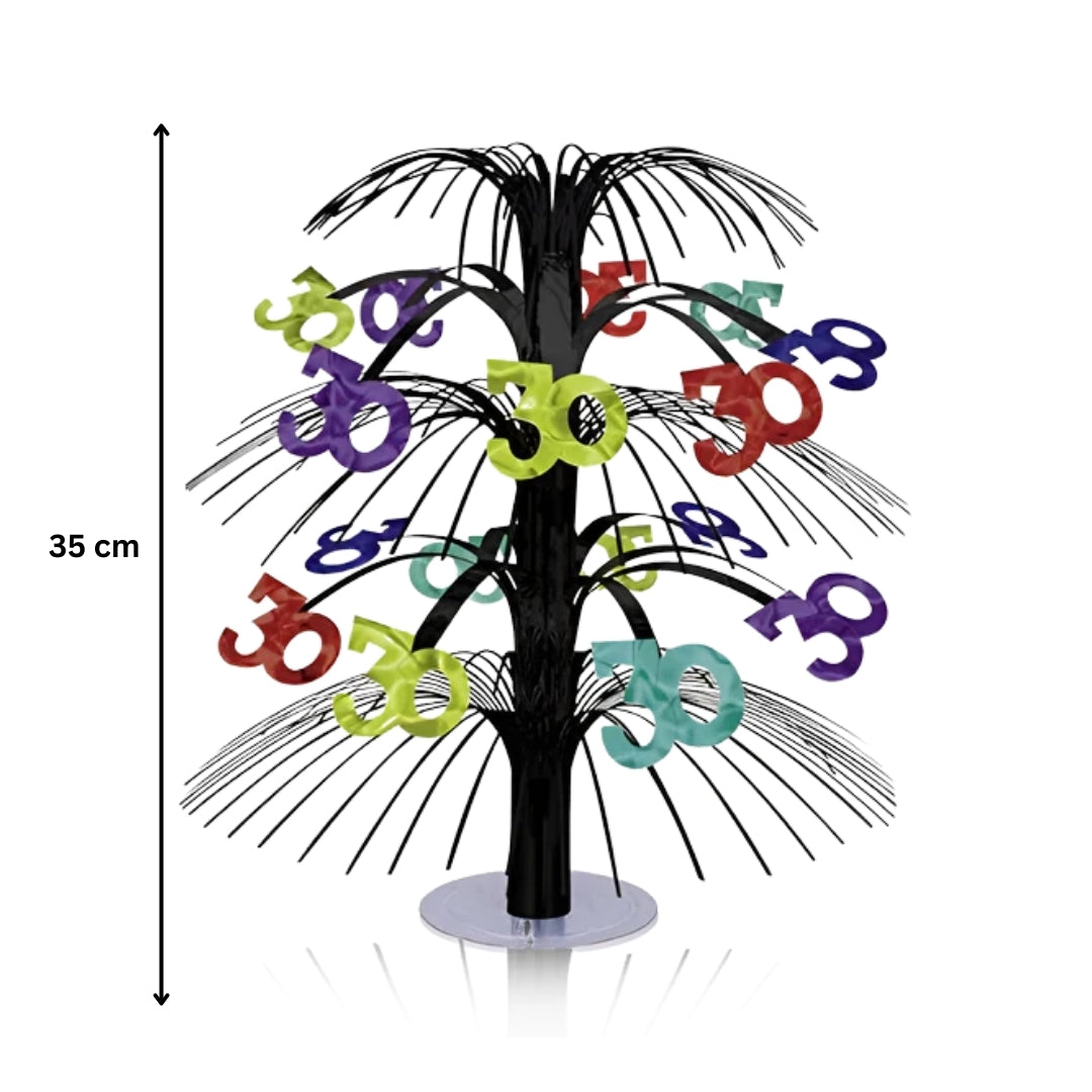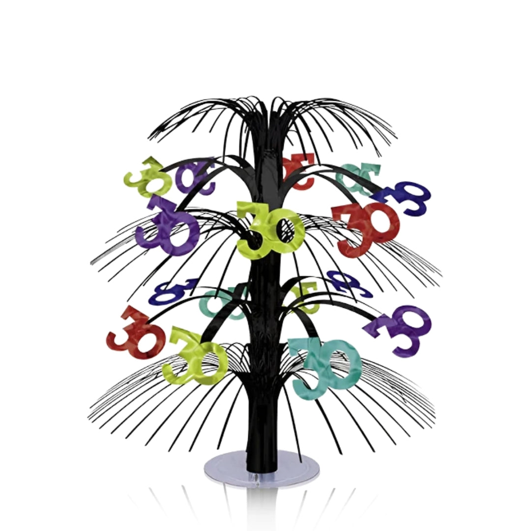 Celebrate in style with this vibrant 30th B'day Cascade Centerpiece! Standing 14 inches (35 cm) tall, it features a bold black base with metallic foil strands and multicolor “30” cutouts that create a dynamic, eye-catching table display. Perfect for milestone birthday decorations, it adds a fun pop of color and instantly transforms any setting into a festive celebration zone.