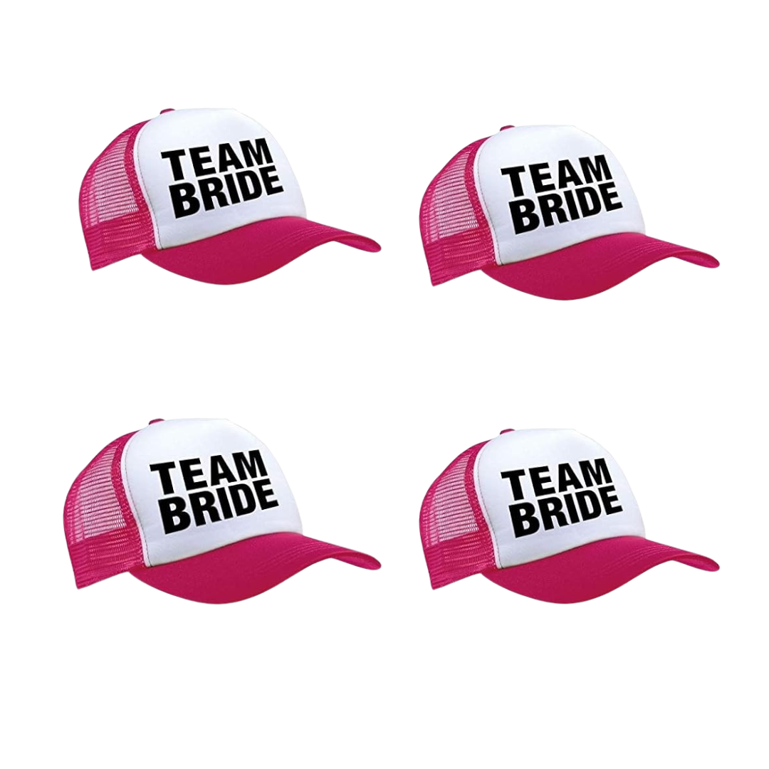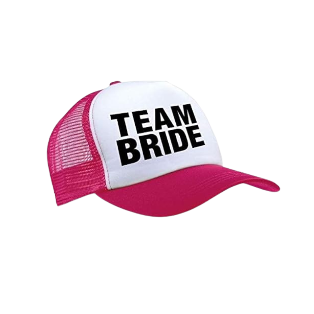 Team Bride Elegance: In vibrant hot pink and crisp white, Emblazoned with the words "TEAM BRIDE," these caps declare your allegiance to the bride, making a stylish statement. Elevate your bachelorette party style with the Team Bride Caps, a perfect accessory for the bride and her fabulous squad.