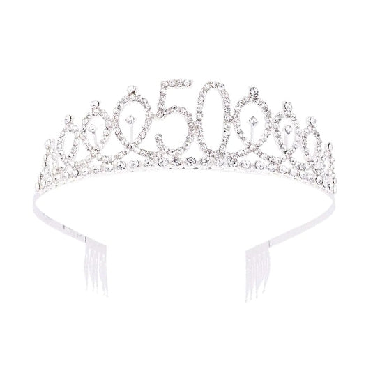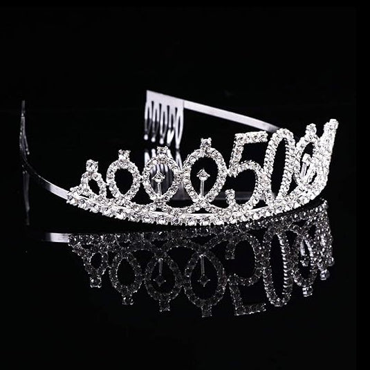 Elegant “50” Centerpiece Design: This dazzling tiara features the number “50” prominently in the center, surrounded by intricate rhinestone detailing—perfect for celebrating a fabulous 50th birthday in royal style.