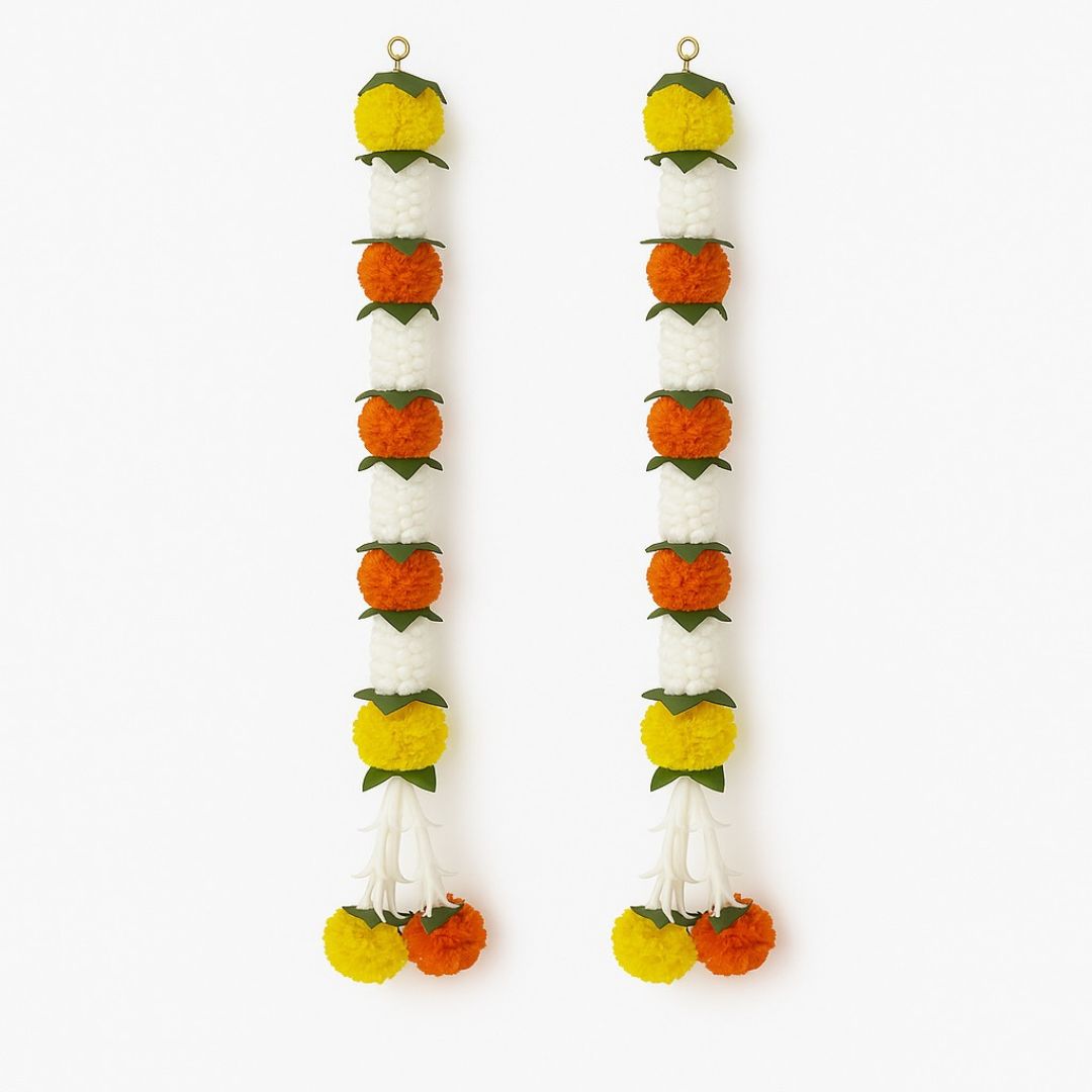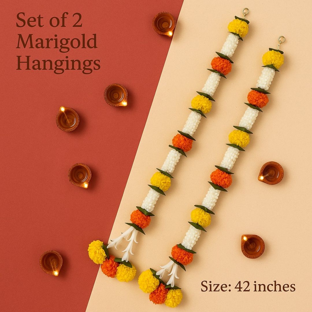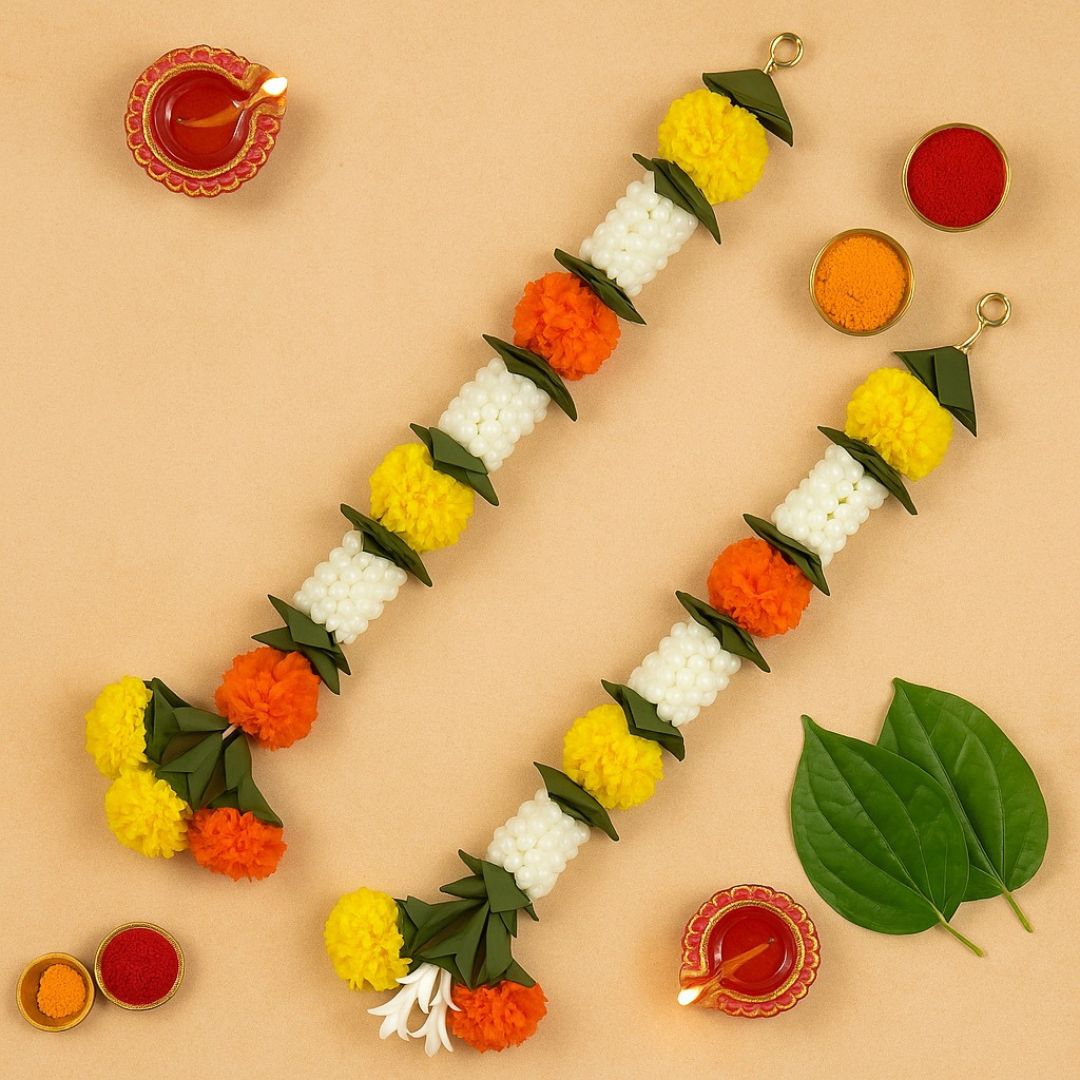 Vibrant Festive Charm: Each garland features a cheerful combination of bright yellow and orange marigold flowers, beautifully paired with delicate white mogra and green accents. A perfect way to bring joyful, colorful vibes to your celebrations and entrances.