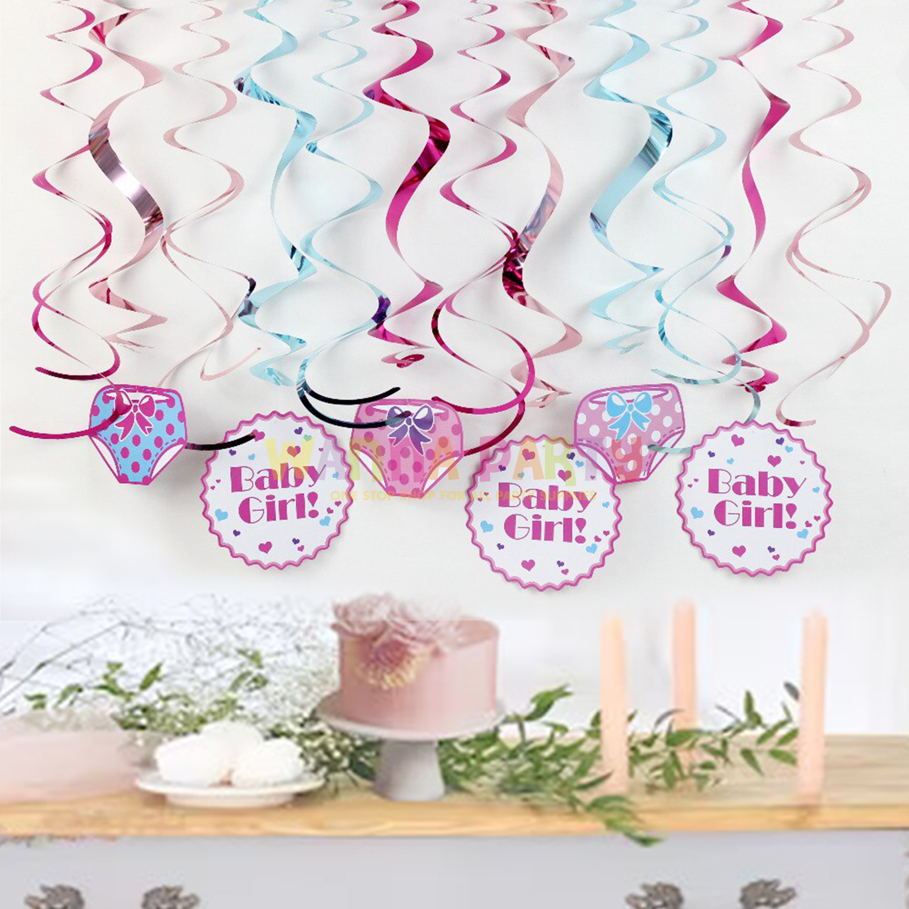 Soft Swirls That Gently Dance Above: These decorations hang beautifully from ceilings, doorways, or windows. As they spin lightly, they create a sense of movement and life in the room. The swirls are decorated with adorable Baby Girl cutouts , making them a delightful addition to any celebration that honors a new beginning.