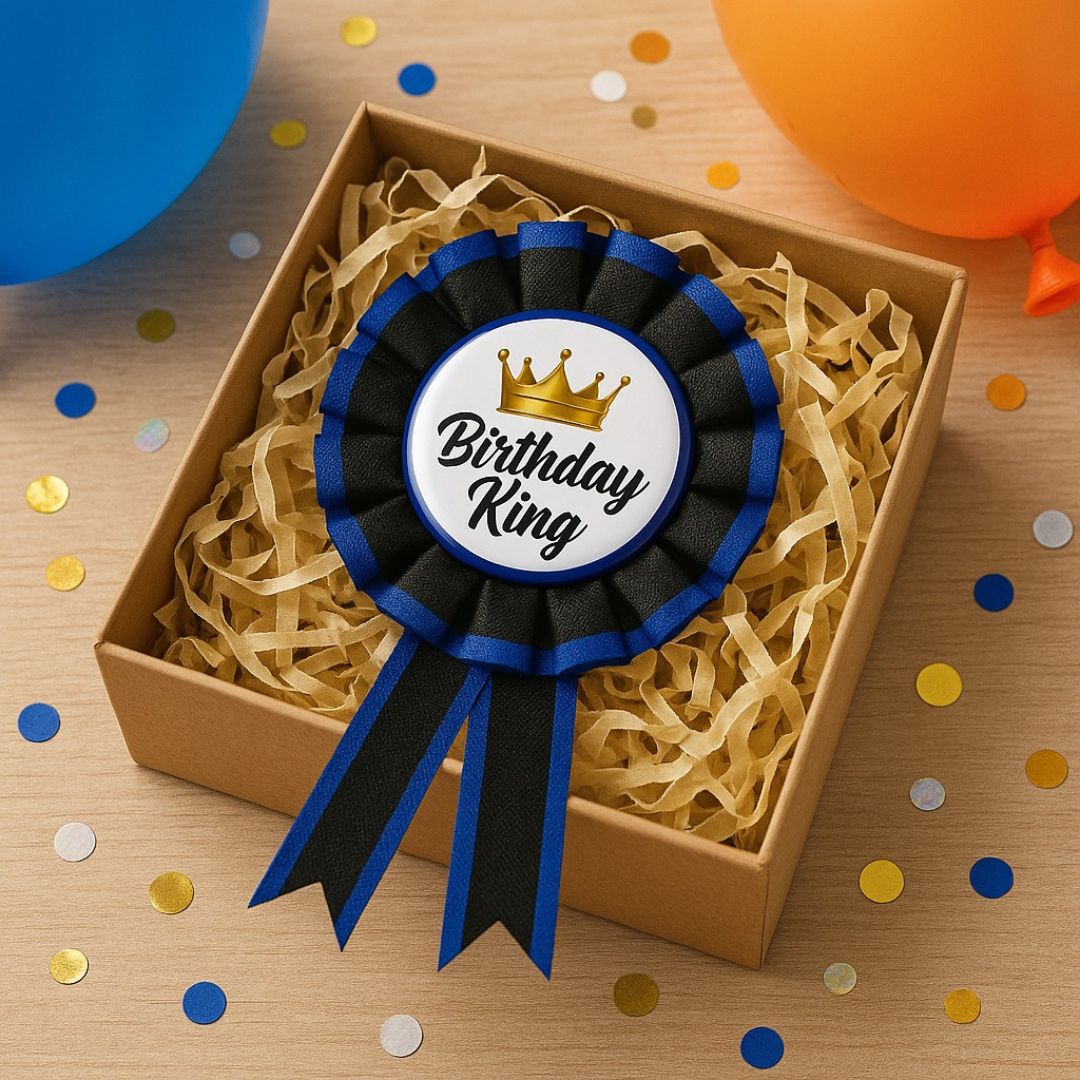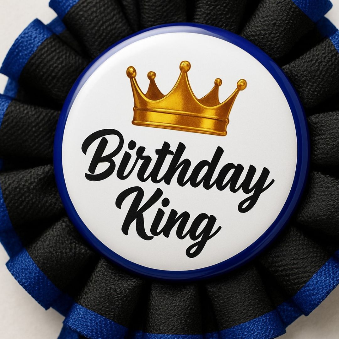 Bold & Regal Design: This "Birthday King" tinplate badge features a striking design with royal-inspired elements like a crown graphic, bold lettering, and a vibrant ribbon. It’s the perfect way to make any birthday boy or man feel like royalty on his special day.