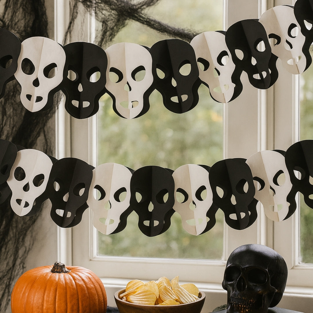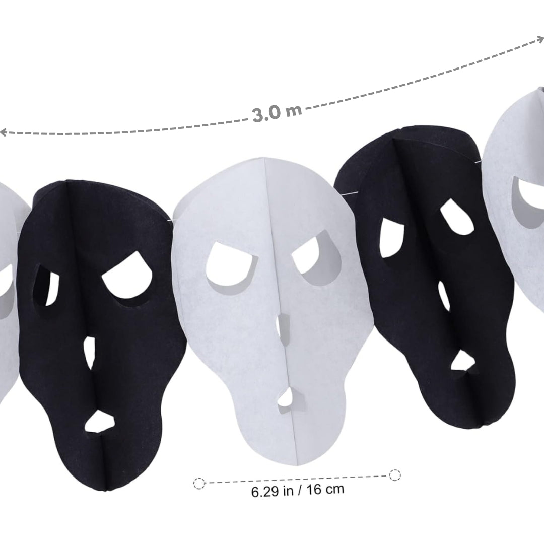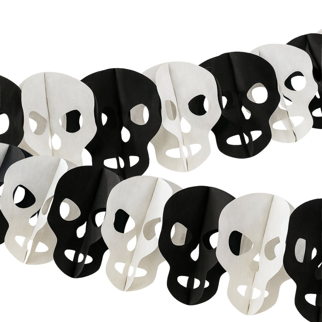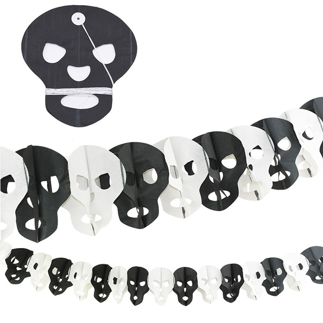 Spooky Black & White Skull Design: Add a creepy yet stylish touch to your décor with this black and white skull garland, perfect for creating a haunted atmosphere for Halloween, gothic parties, or themed events.