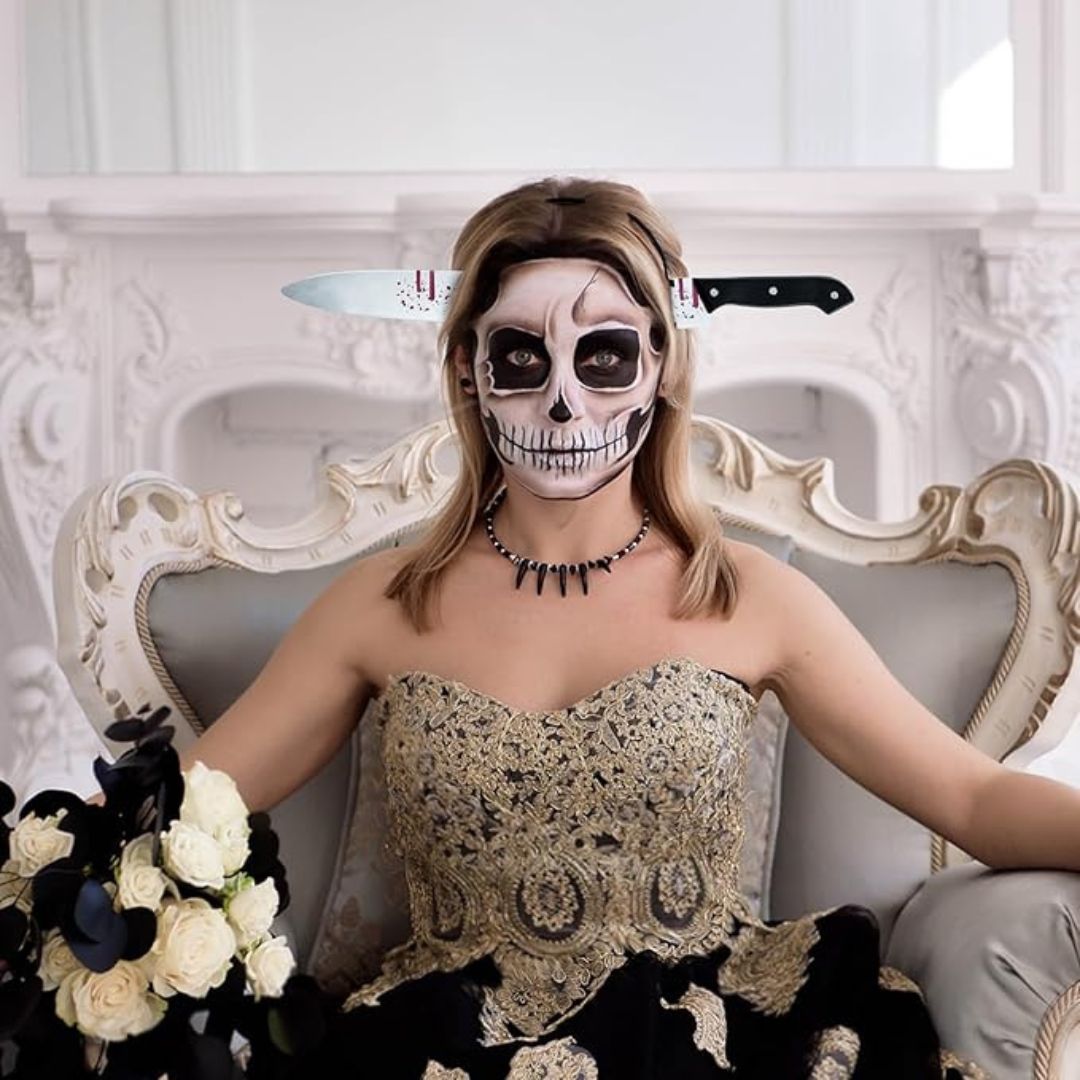 SCARY PROP:Bleeding Knife Headband features a flexible elastic headband with an attached pvc ?bleeding? knife. It is a scary hair hoop with bloody prop decoration, which looks very creepy and realistic.