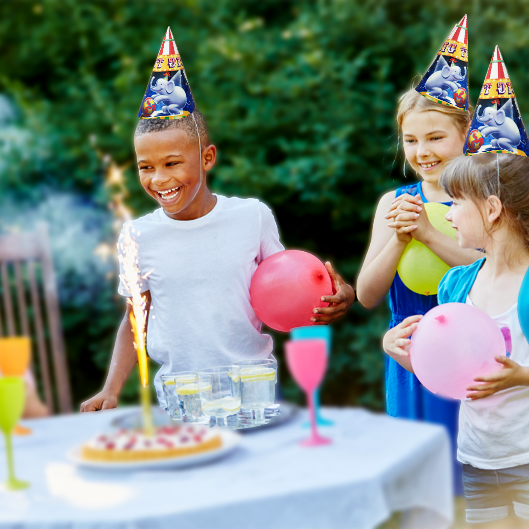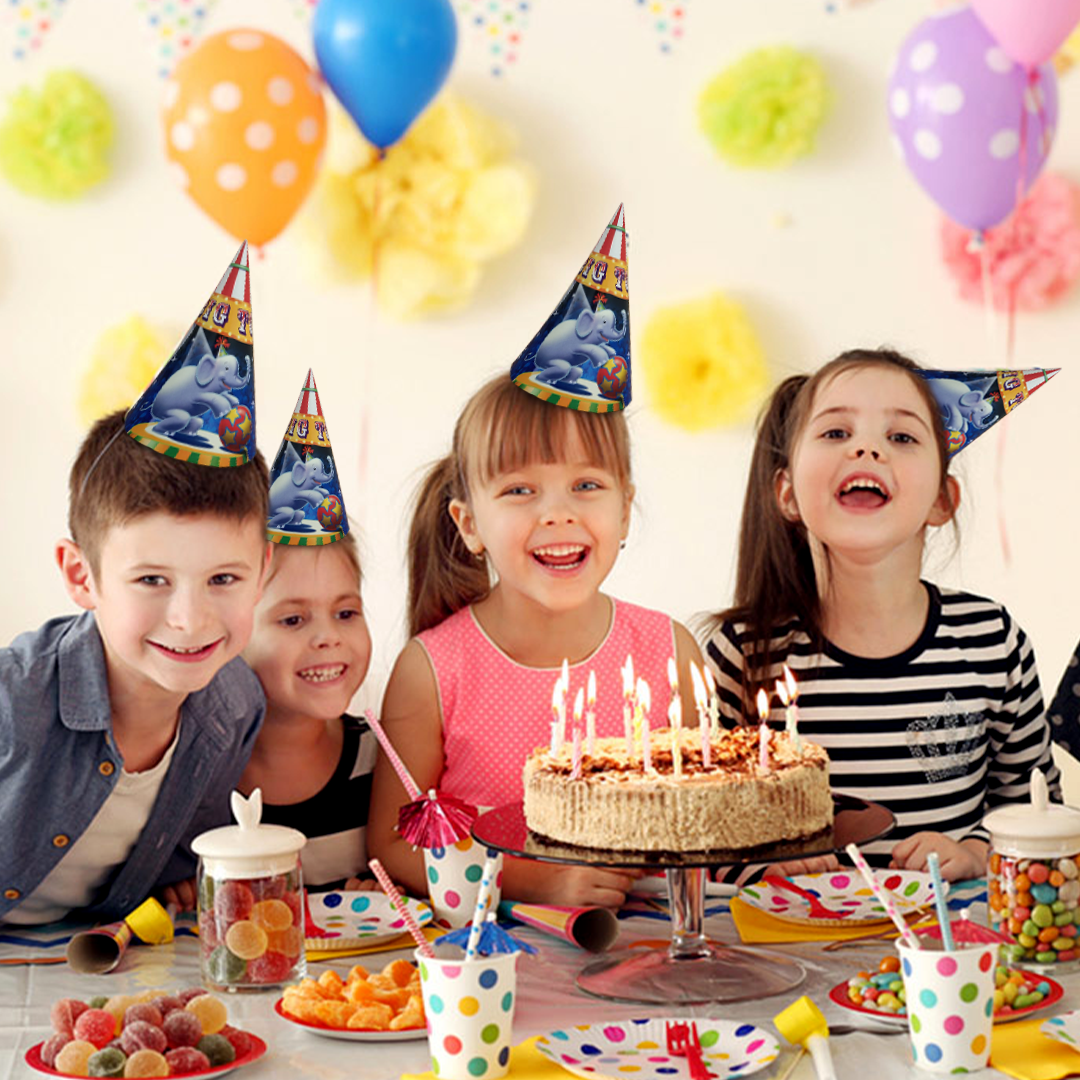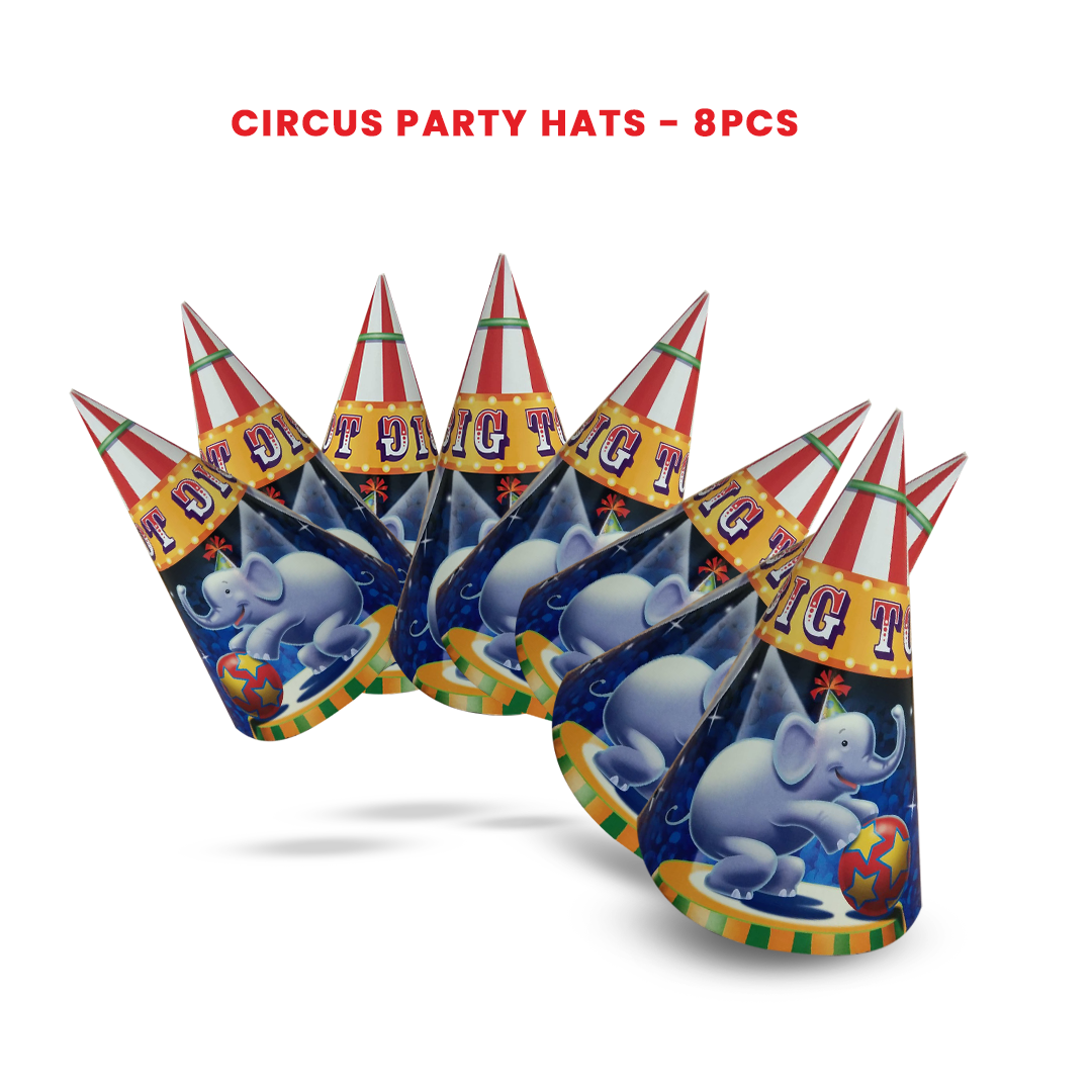 Pack of 8 Hats: The set includes 8 vibrant circus-themed party hats, ideal for group celebrations and parties.