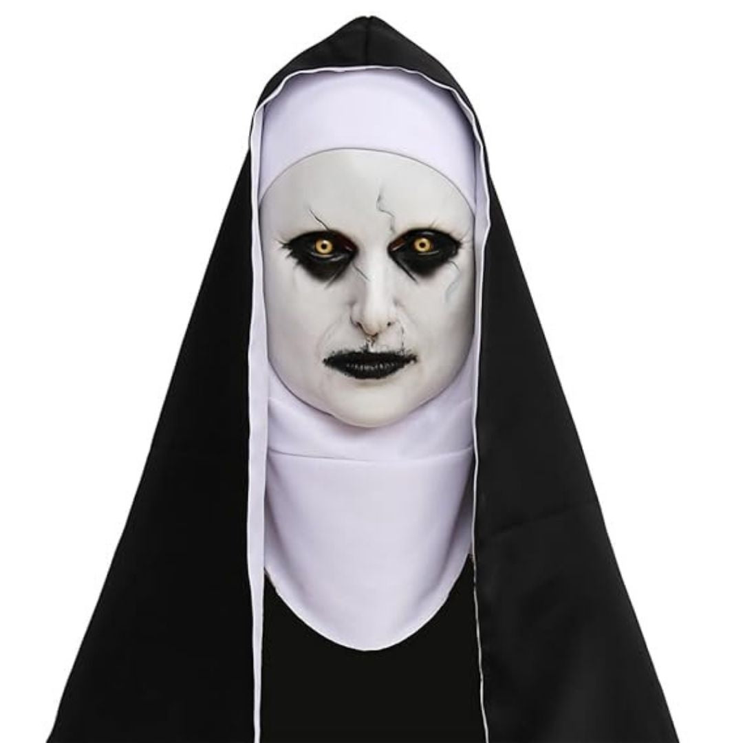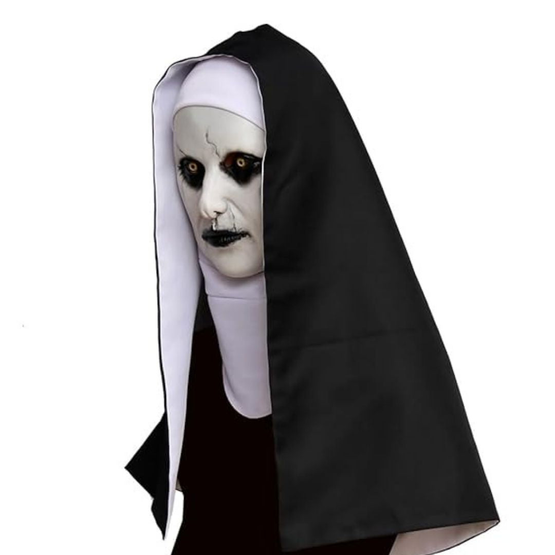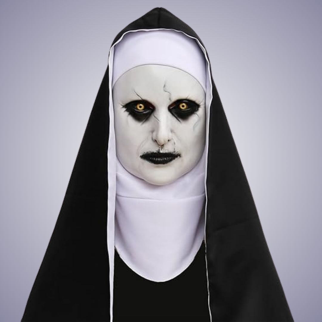 Full Head Coverage with Black Scarf: The mask includes an attached black fabric scarf that drapes over the head and shoulders, completing the eerie nun look and ensuring a more immersive and spine-chilling costume.