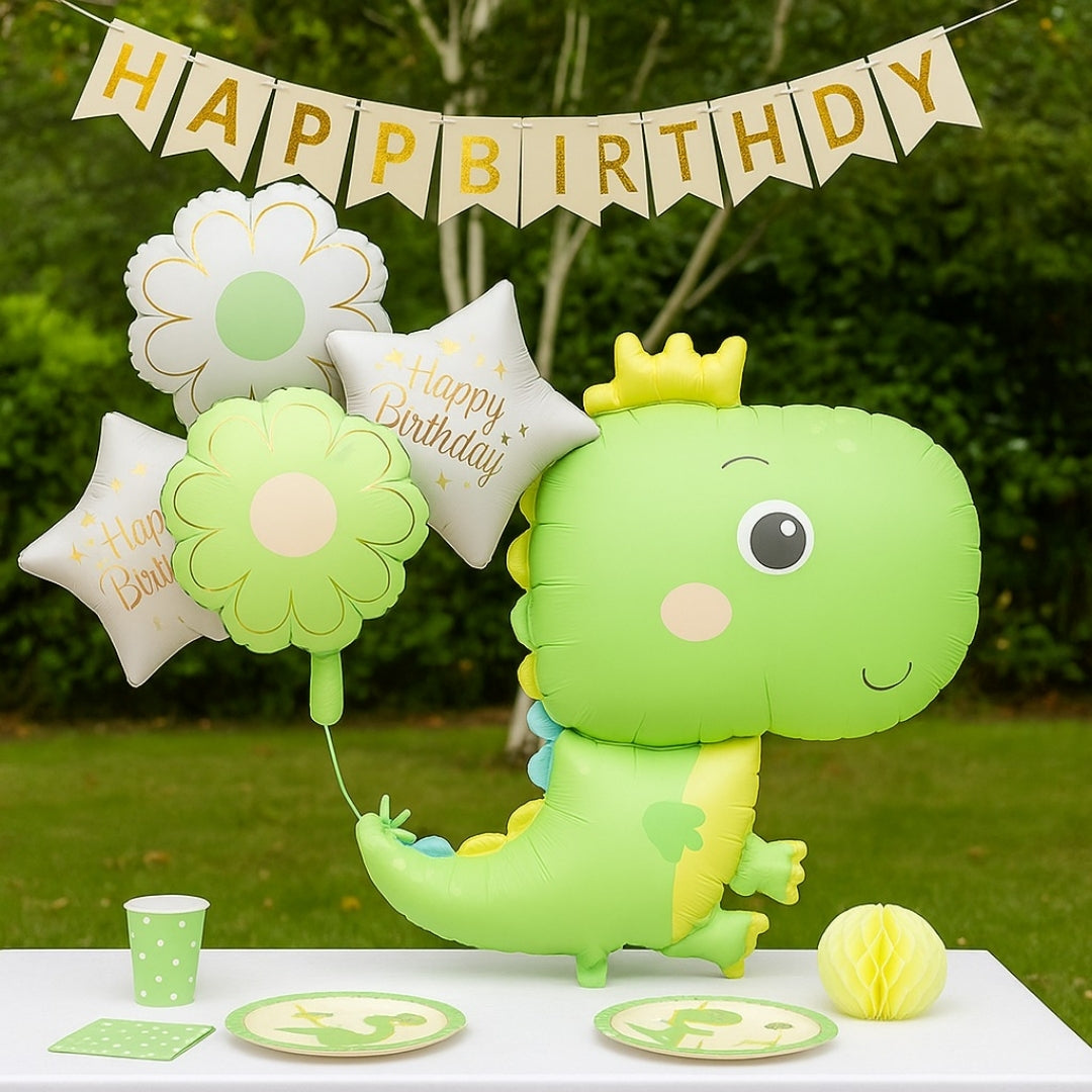 π Adorable Dinosaur Design: The set includes one large pastel green dinosaur-shaped foil balloon with a smiling face and cute details, perfect for adding charm and fun to any dinosaur or jungle-themed celebration.
