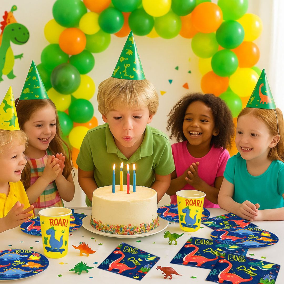 Complete 40-Piece Party Pack: Includes matching dinosaur-themed paper plates, cups, and napkins, creating a coordinated table setup perfect for kids’ birthday celebrations.