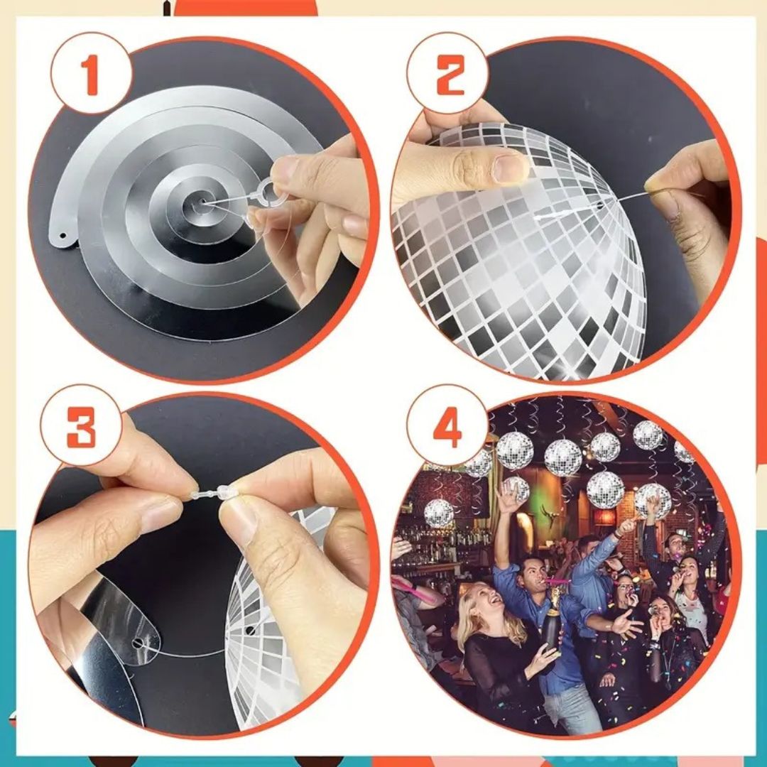 Pack of 6 Sparkling Swirls: Includes 6 metallic hanging swirl decorations, each featuring a reflective mini disco ball that spins and catches the light, creating a dazzling party atmosphere.