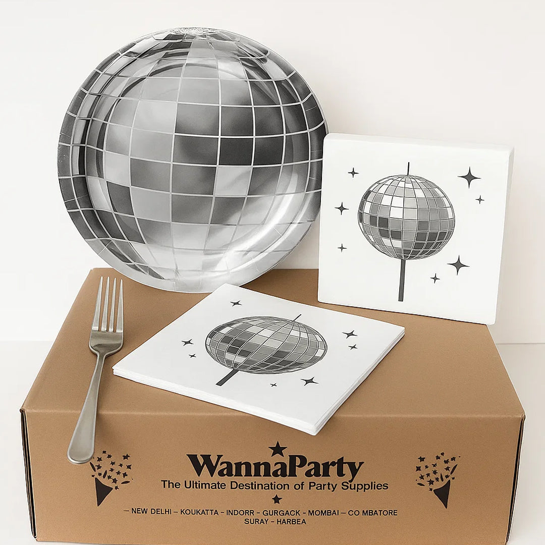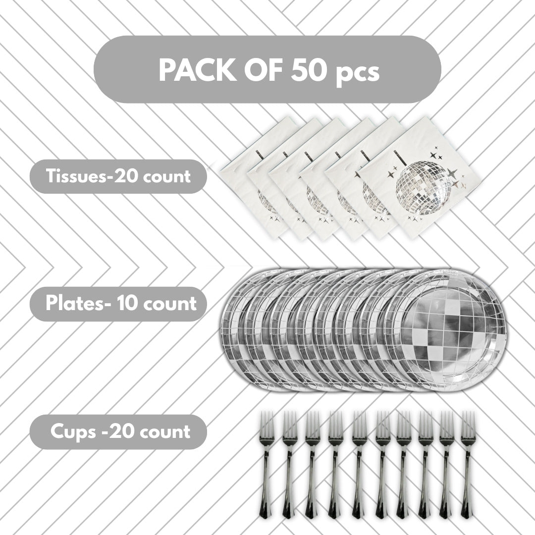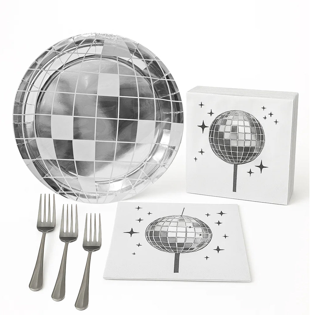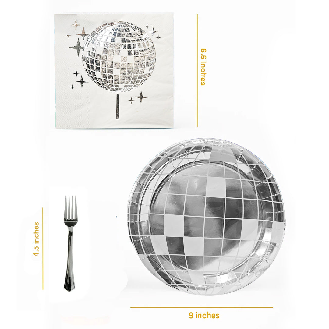 Package Includes: This disco plates can serve 10 guests which includes 10 9 inches disco ball plates , , 20 sliver forks and 20 double-ply napkins. Disco party plates is of ideal size 9" to serve starters or food and this disco ball theme tableware set are enough for your house party