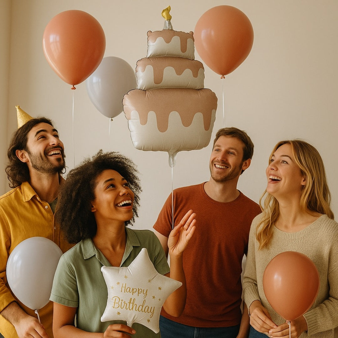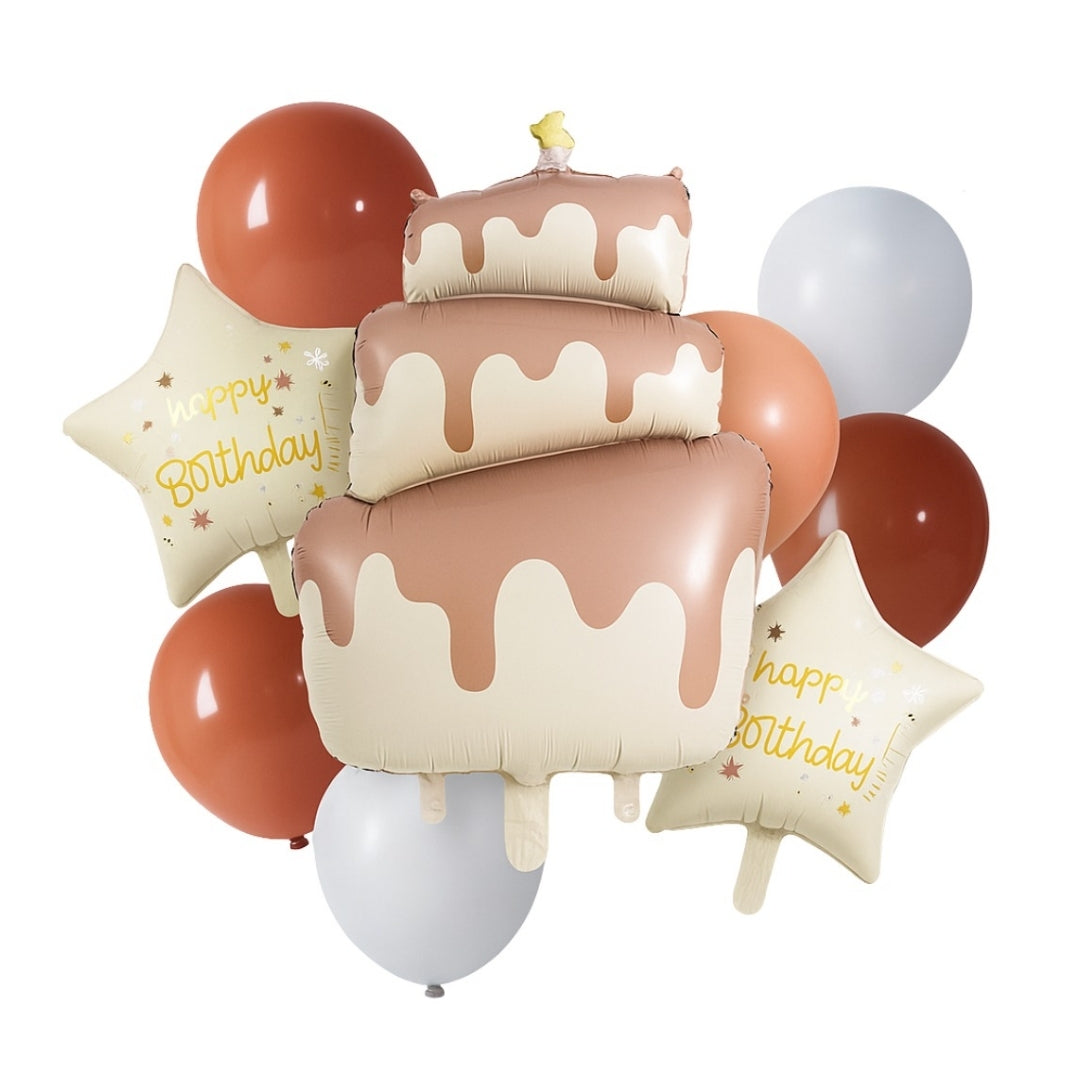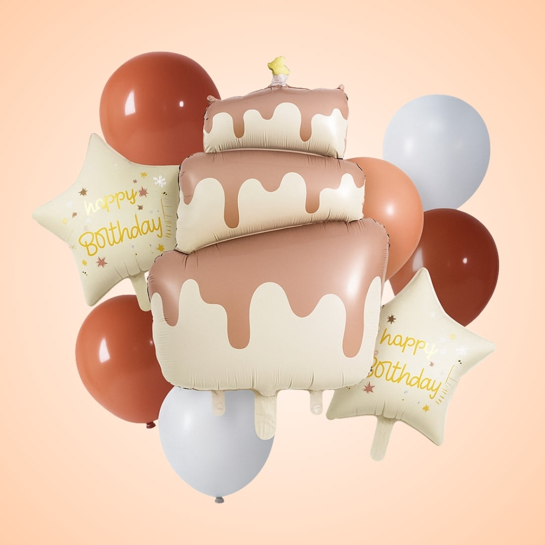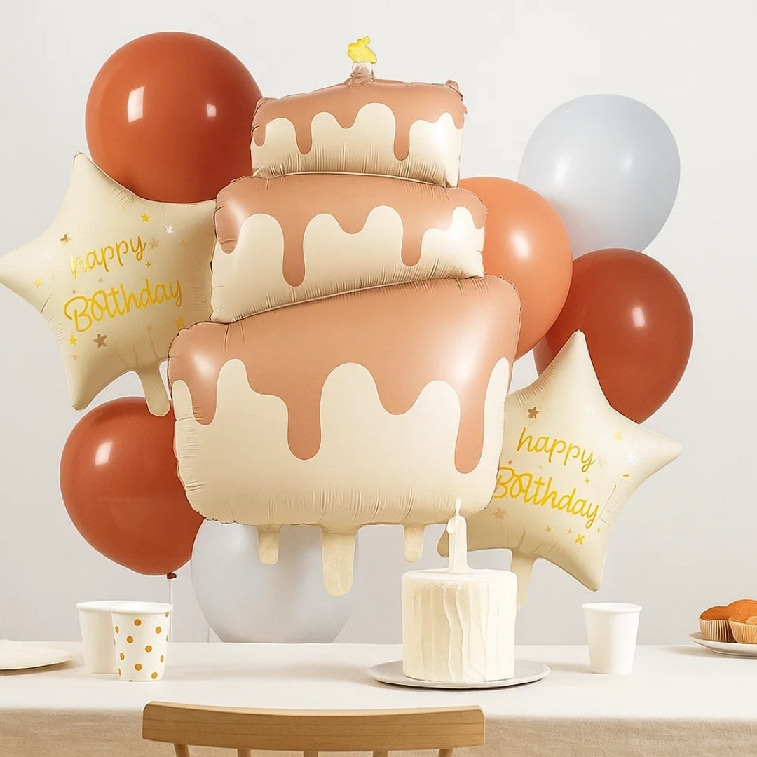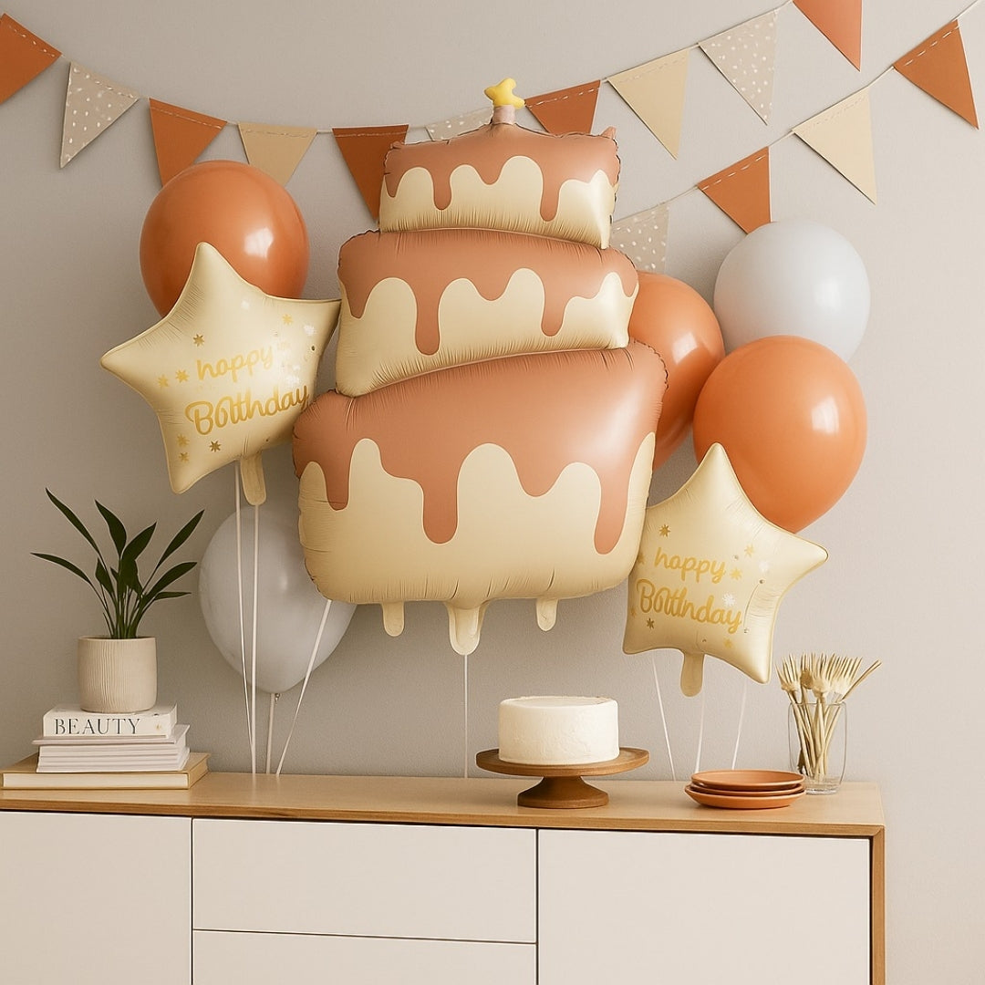 Supershape Dripping Chocolate Cake Balloon: Features one large, supershape foil balloon designed like a multi-layered chocolate cake with rich dripping chocolate and candle details—instantly becoming the centerpiece of your birthday decor.