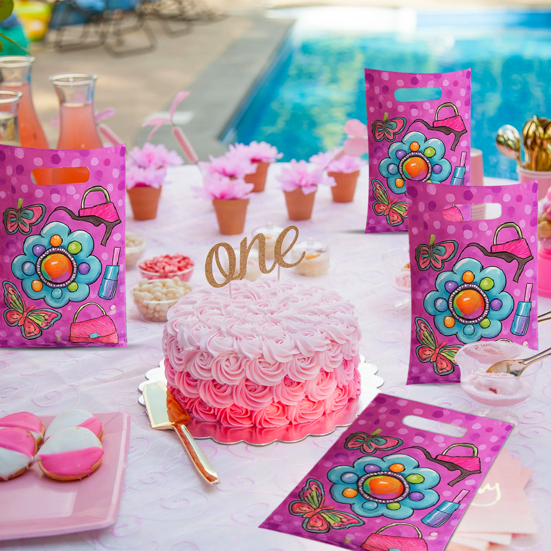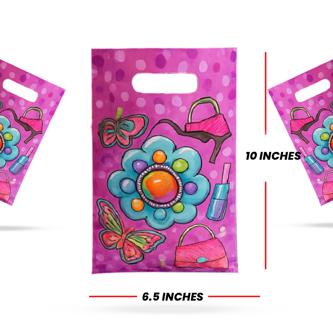 Design: These Glitzy Girl loot bags showcase a vibrant pink background with fun illustrations of flowers, butterflies, lipstick, and purses. The colorful mix of pink, orange, blue, green, and purple makes them perfect for stylish and lively party themes.