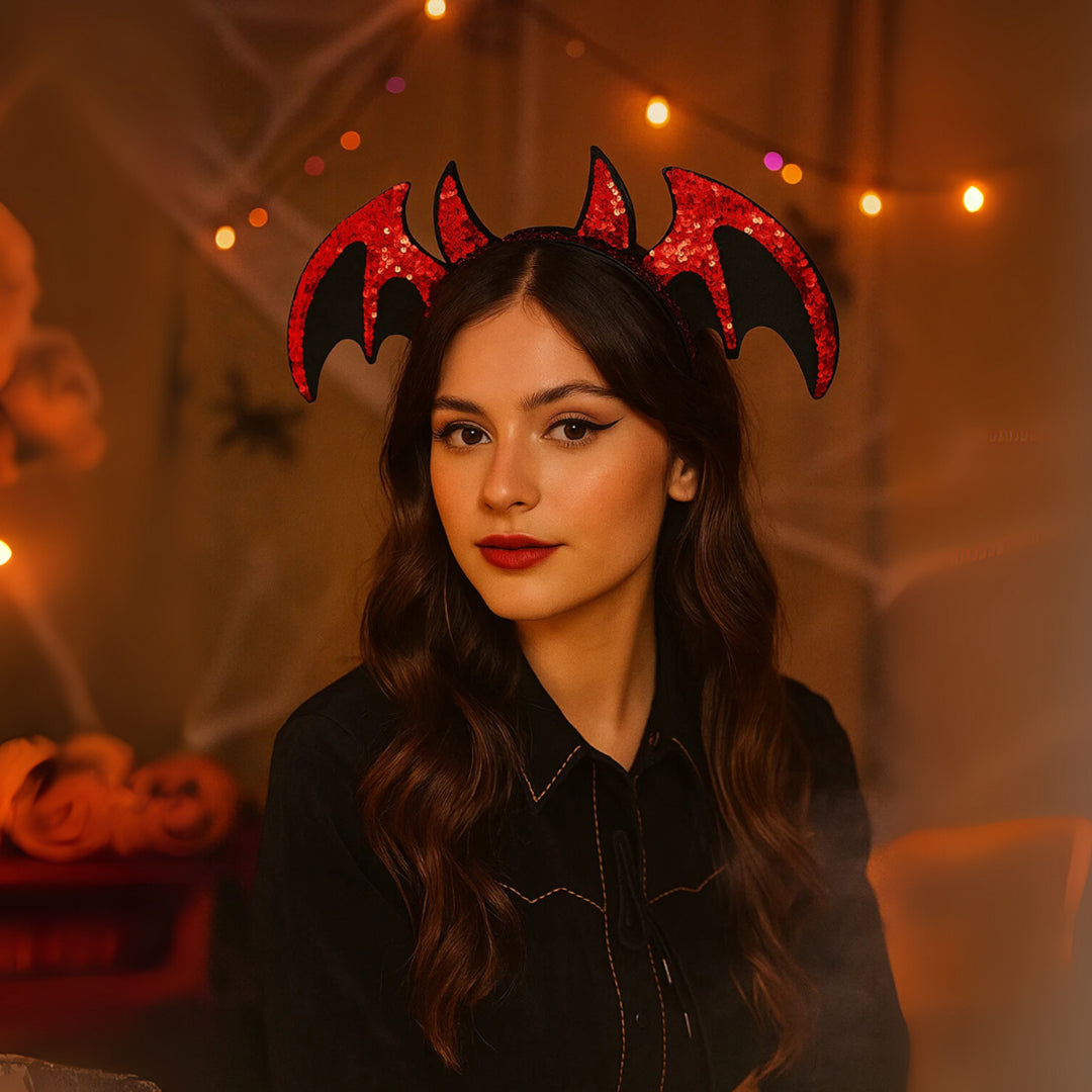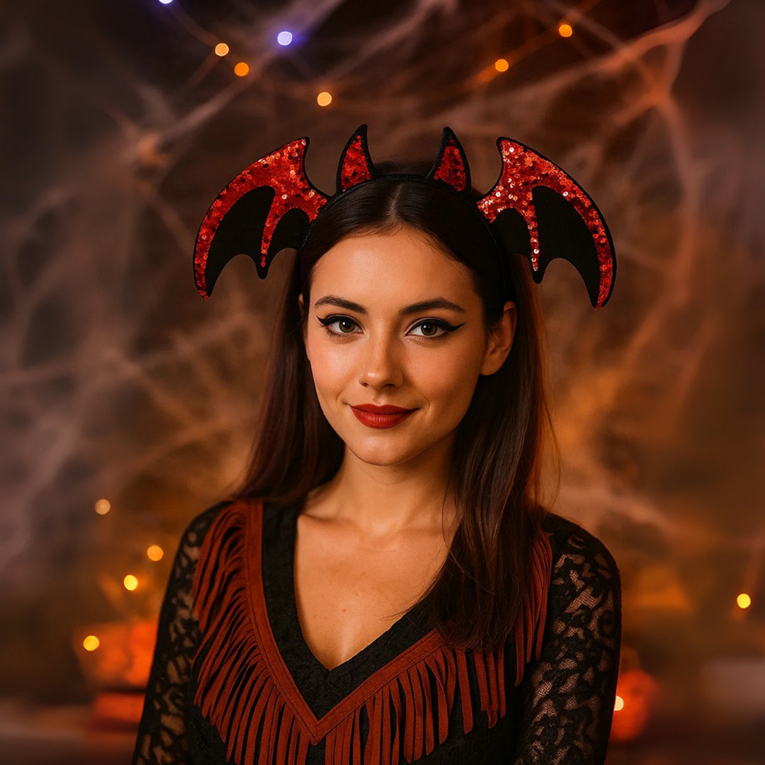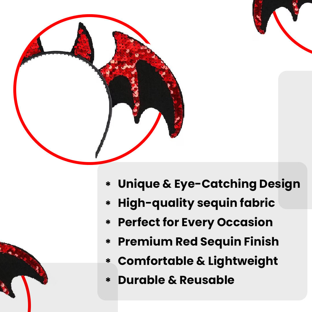 Stylish Gothic Design: Make a bold fashion statement with this red and black sequin bat headband featuring dramatic black horns and shimmering bat wings on both sides. Perfect for Halloween, costume parties, or gothic-themed events, it adds an edgy and eye-catching touch to any outfit.