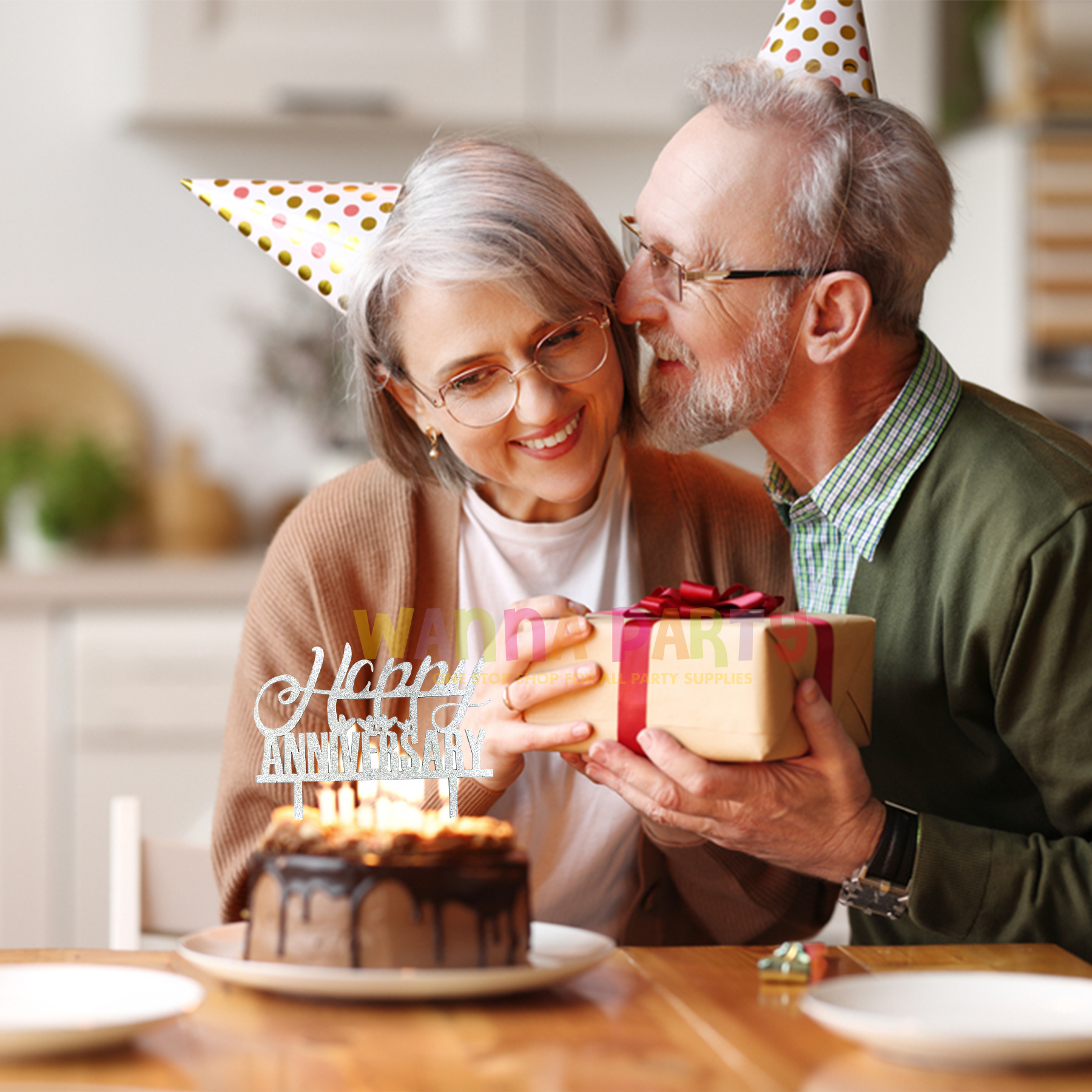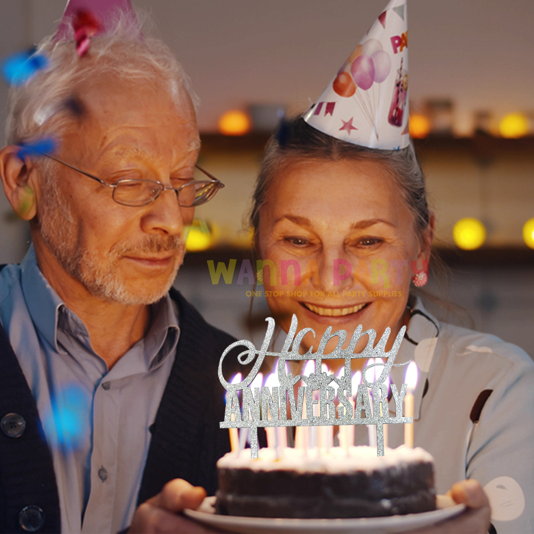 Classic Script Design: The cake topper features a classic script design that spells out "Happy Anniversary," adding a personalized and celebratory element to your cake. The silver finish enhances the script, creating a visually appealing focal point for your dessert.