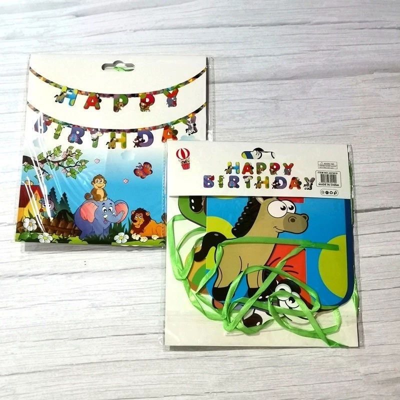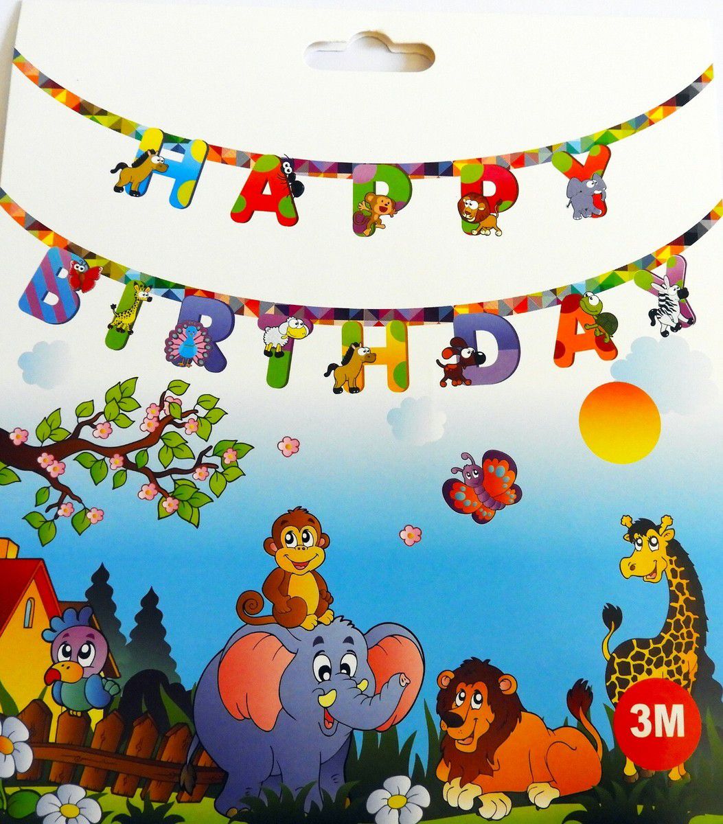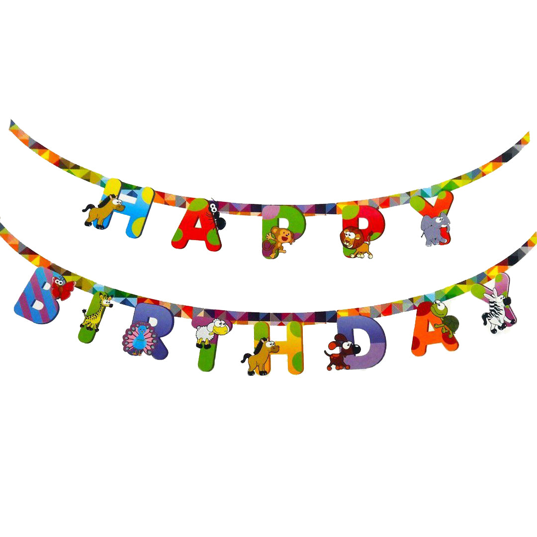 Vibrant Jungle Theme: This banner features a fun and colorful jungle design with playful animals like lions, monkeys, elephants, and giraffes surrounding the bold “Happy Birthday” message—perfect for animal-loving kids.