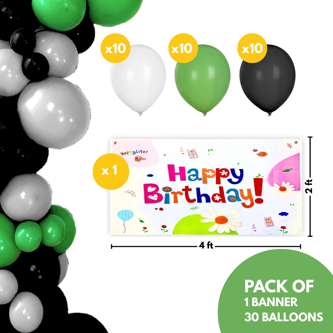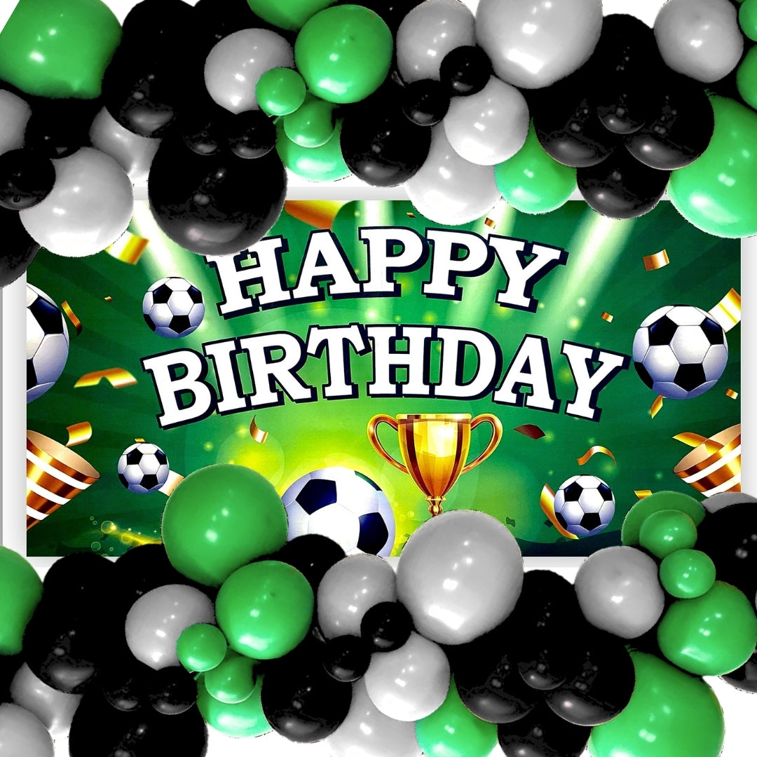 Happy Birthday Soccer Banner w/ Green & Black Latex/ Rubber Balloons - 4FT x 2FT - 1PC