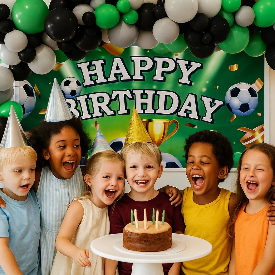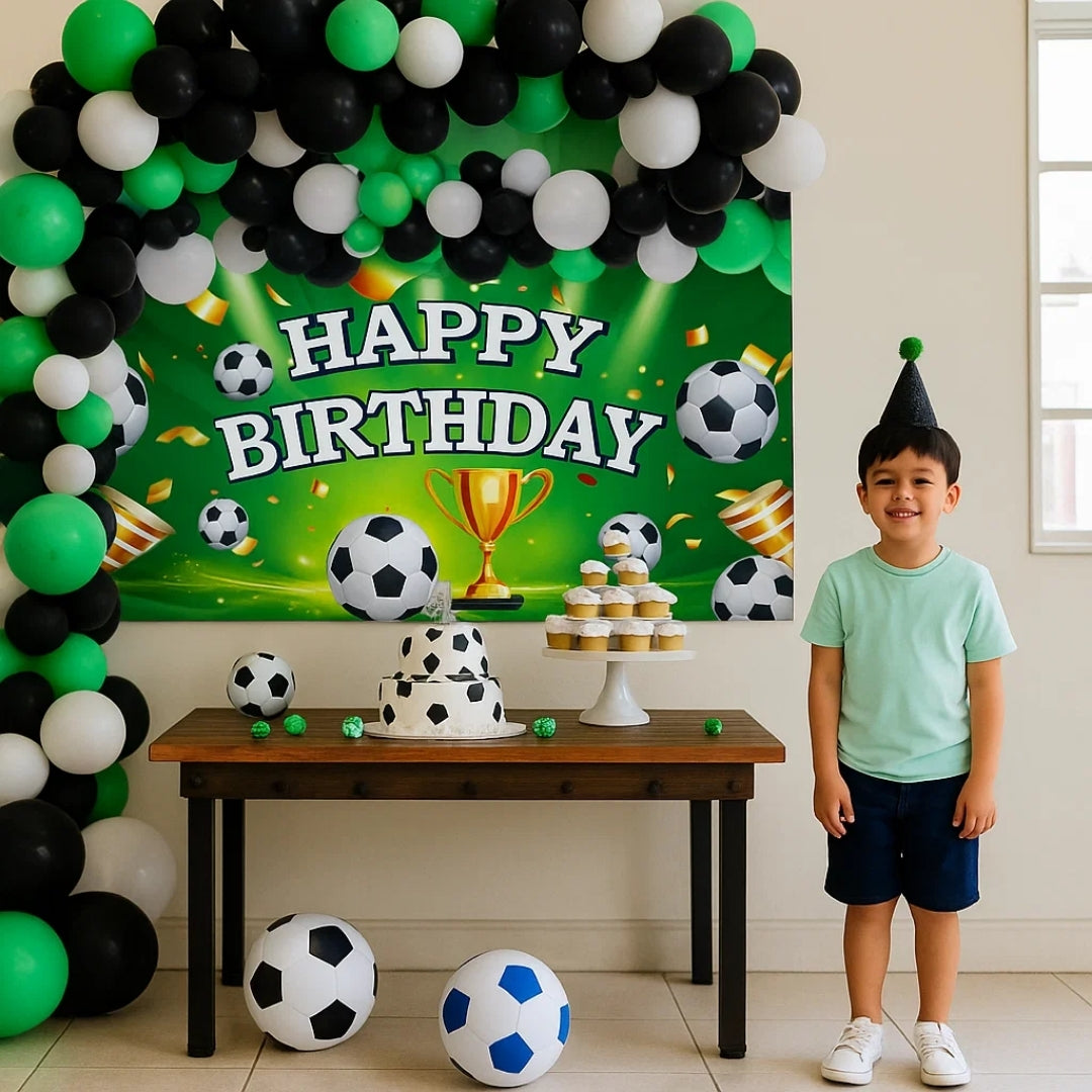 🎈 Complete Party Decor Kit: This set includes 25 elegant black, white, and green latex balloons and 4 dazzling confetti balloons, along with a stylish Soccer “Happy Birthday” backdrop banner—all you need to create an eye-catching balloon arch and festive atmosphere for any birthday celebration.