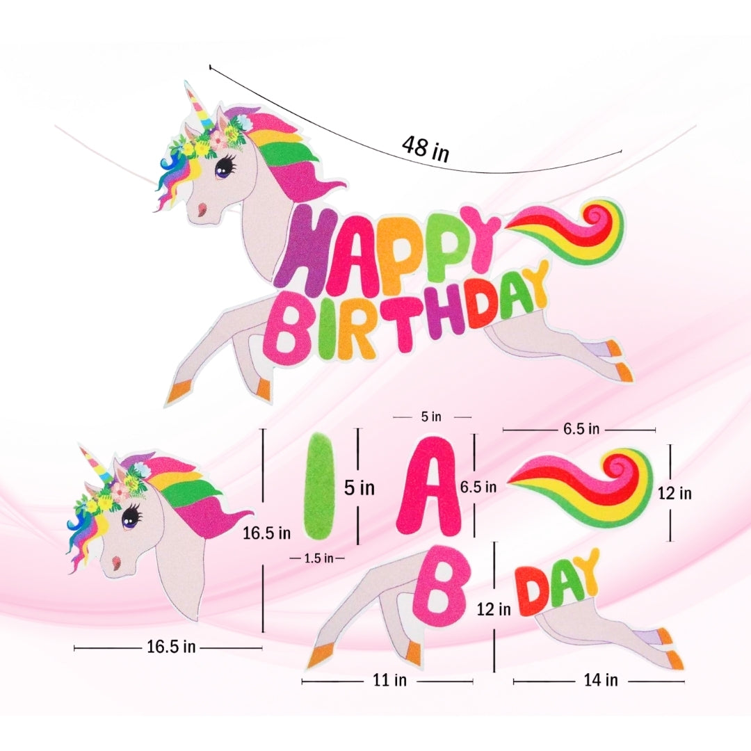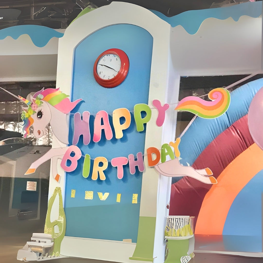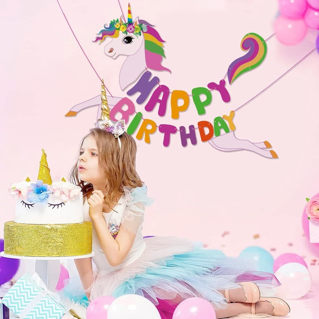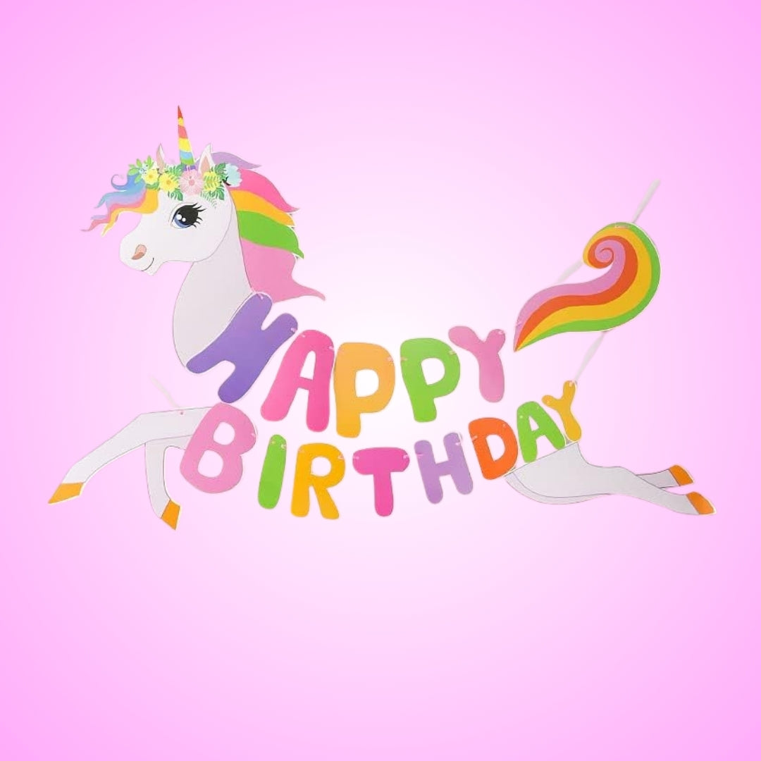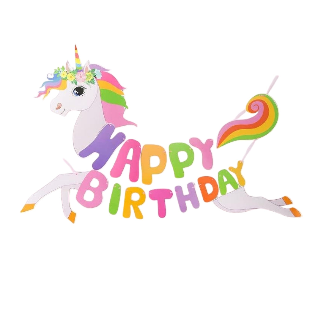 Magical Unicorn Design: Features a vibrant pastel-colored unicorn with a rainbow mane and tail, carrying bold “HAPPY BIRTHDAY” letters—perfect for adding a whimsical touch to your celebration.