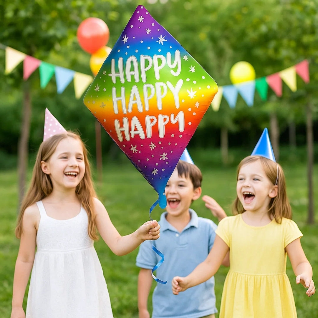 Vibrant Diamond Shape Design: Celebrate in style with this colorful diamond-shaped foil balloon featuring the cheerful text "HAPPY HAPPY HAPPY" on a rainbow background with silver star accents—perfect for adding joy and brightness to any celebration.