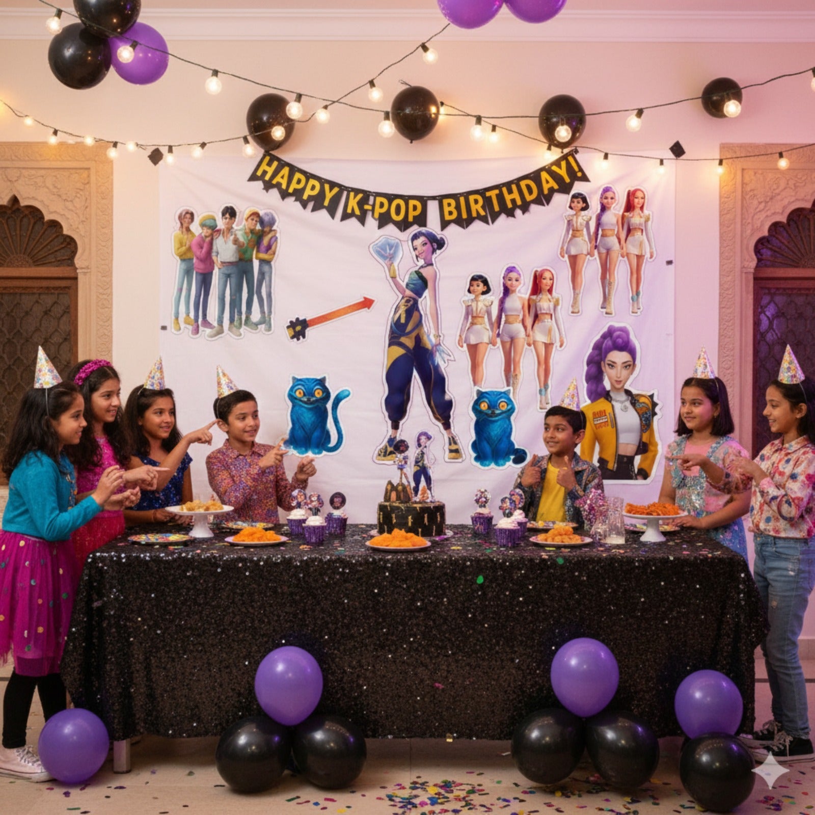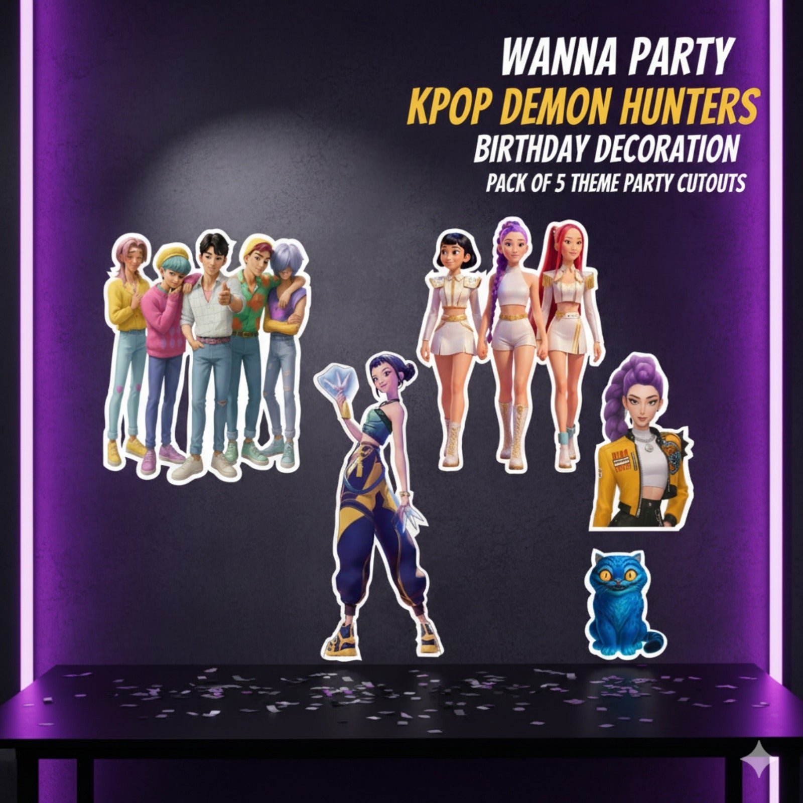 Bold Kpop Demon Hunters Theme: This pack includes 5 high-quality paper cutouts inspired by iconic Demon Hunters aesthetics—perfect for fans who love dark fantasy, edgy K-pop visuals, and anime-style artwork. Ideal for creating a dramatic and immersive birthday setup.