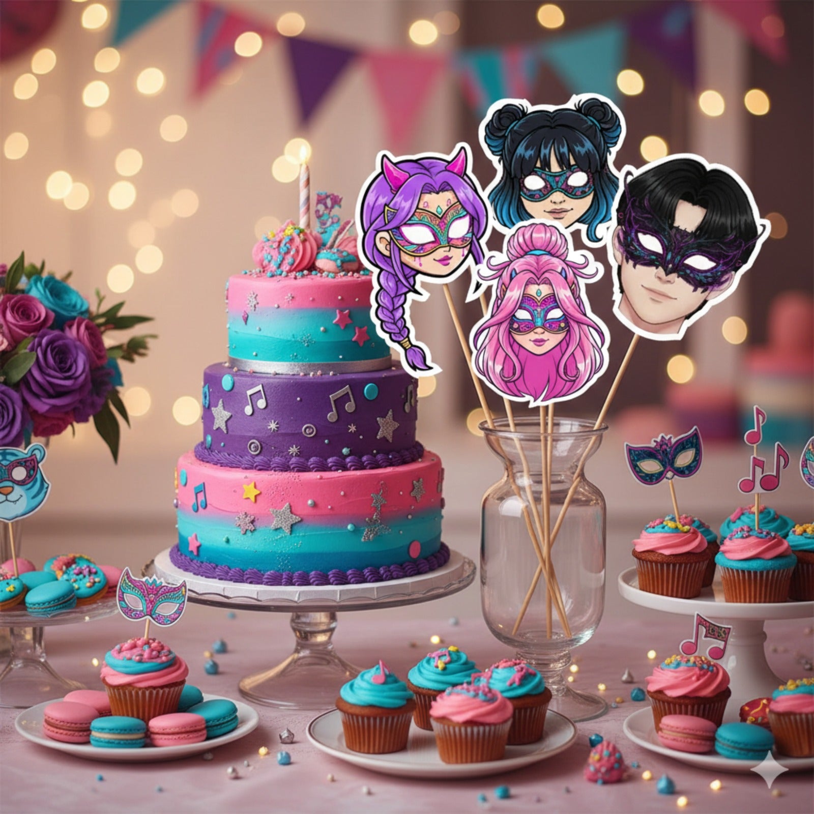 Exciting Kpop Demon Hunters Theme: This set includes 5 dynamic photobooth props inspired by the popular Demon Hunters universe, featuring iconic symbols, character elements, and stylish K-pop designs that fans love. Perfect for boys’ and girls’ themed birthdays, parties, and fan events.