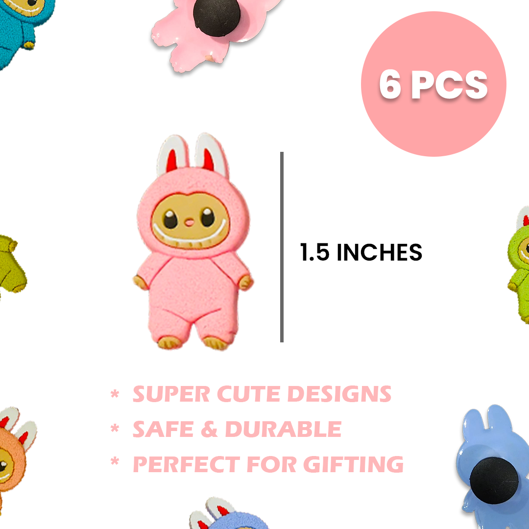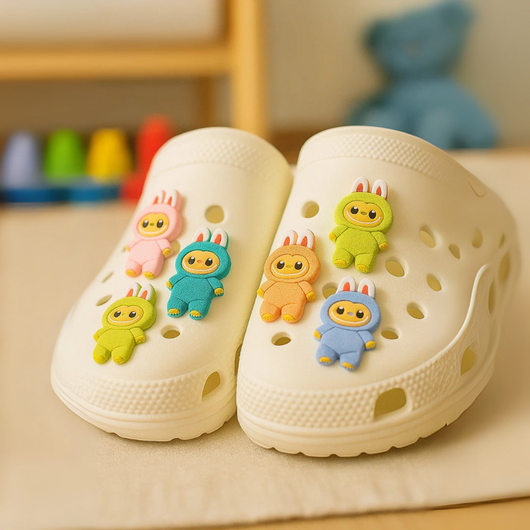 Vibrant Labubu Doll Character Designs: This adorable set features 6 uniquely designed Labubu doll charms in a range of bright, eye-catching colors. Each charm beautifully captures the whimsical and playful spirit of the beloved Labubu doll, making it a delightful choice for fans, collectors, or anyone who loves cute accessories. Whether you're just starting your collection or adding to your favorites, these Labubu shoe charms are a must-have.