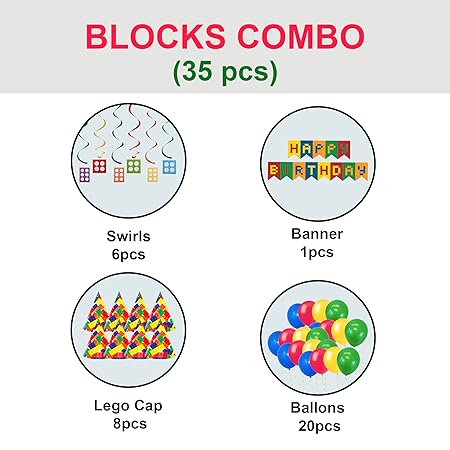 HIGH-RESOLUTION PRINT: These Lego theme-based props such as hats, banners and swirl decorations are printed at high-resolution. Swirl decorations with bright-coloured building blocks printed on them add a burst of colour to your child's party.