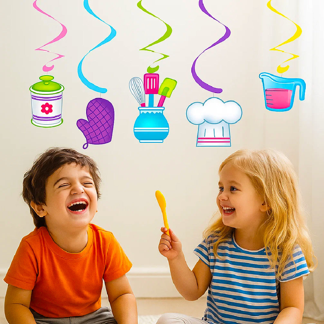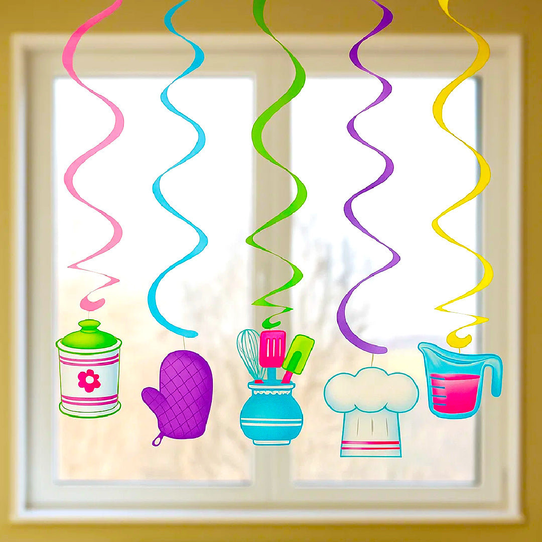 Design: These chef-themed danglers feature adorable cutouts like an oven mitt, measuring cup, chef hat, and kitchen utensils in vibrant pink, blue, green, purple, and yellow shades. They add a playful, cooking-inspired charm to any celebration or themed setup instantly.