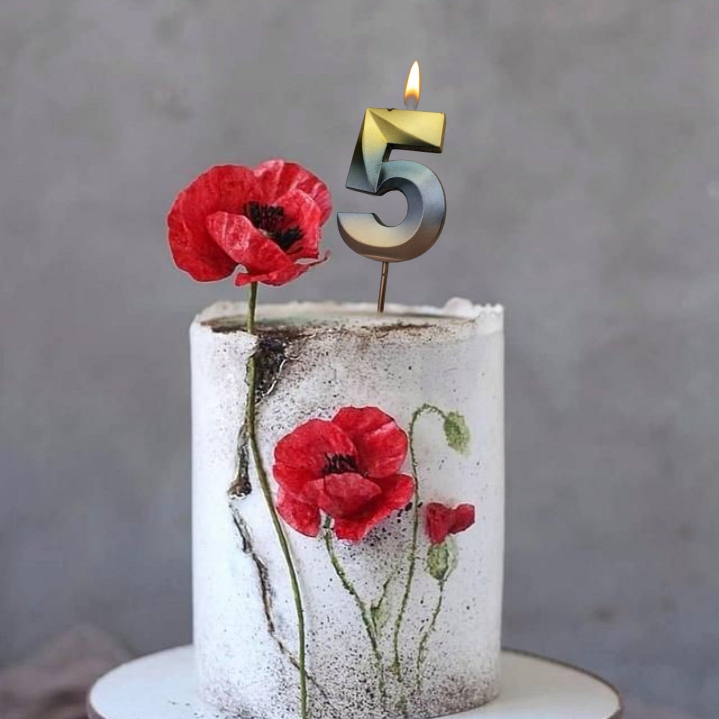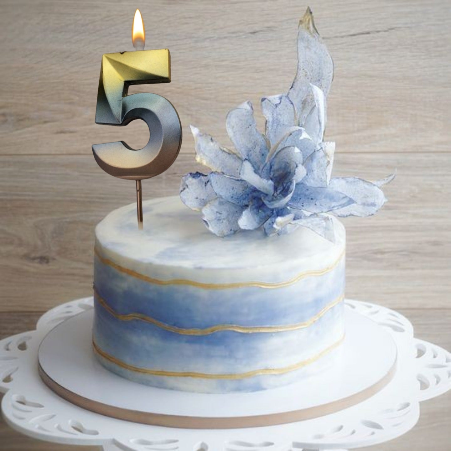 STYLISH DESIGN:Our Numerical Candle Number 5 features a sleek and stylish design that effortlessly enhances any cake, cupcake, or dessert. Featuring a beautiful metallic golden, purple and pink shade, the candle is carefully shaped into the number five , ensuring a clear and distinct presentation.