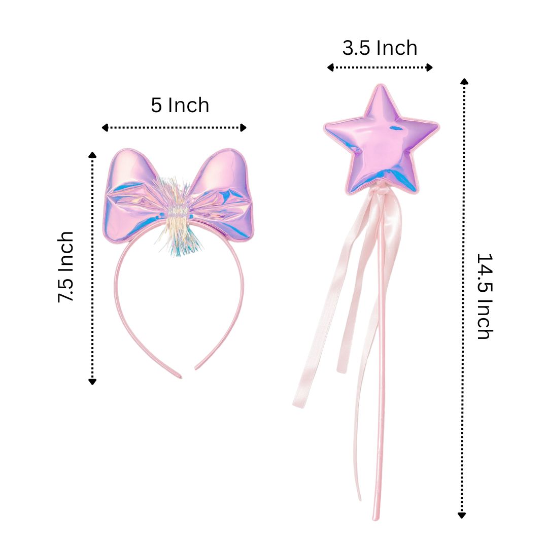 Magical Iridescent Design: This adorable set includes a shiny iridescent bow headband and a matching wand, both designed to sparkle and change color beautifully in the light, perfect for adding a touch of fairy-tale magic to any outfit.