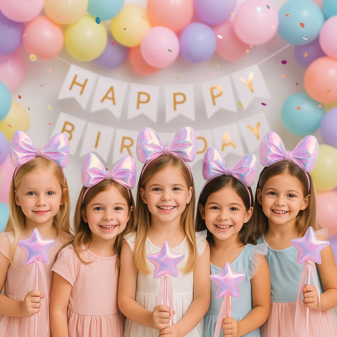 Charming Bow Headband: The headband features a large, eye-catching bow made from shiny, holographic material that reflects a rainbow of pastel colors, creating a dreamy look that makes any little girl feel extra special.