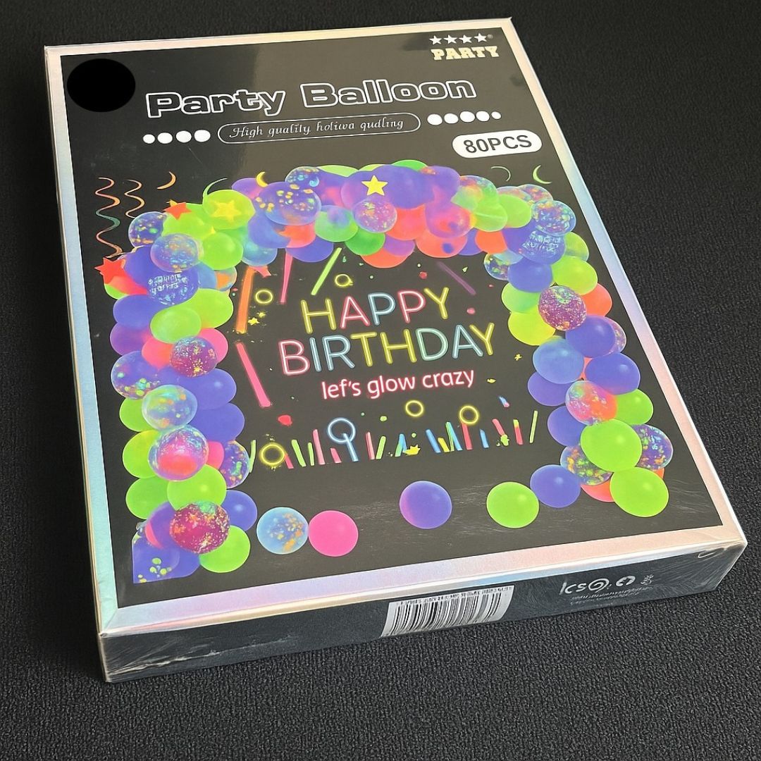 Neon Happy Birthday Banner with Glow in the Dark Balloon Arch Decoration Kit - 80PC