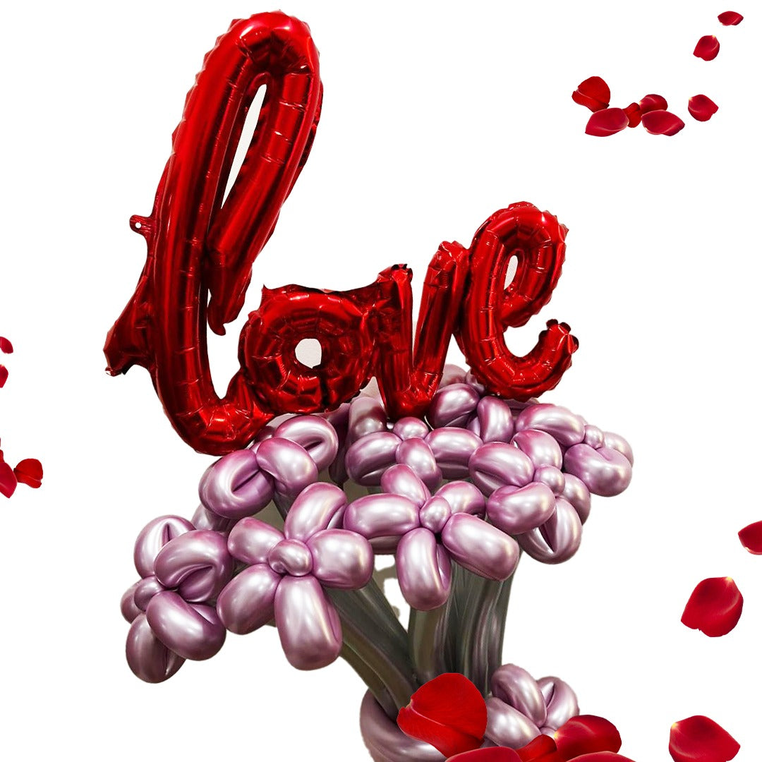 Pink Flower Balloons with Silver Sticks and Love Bouquet