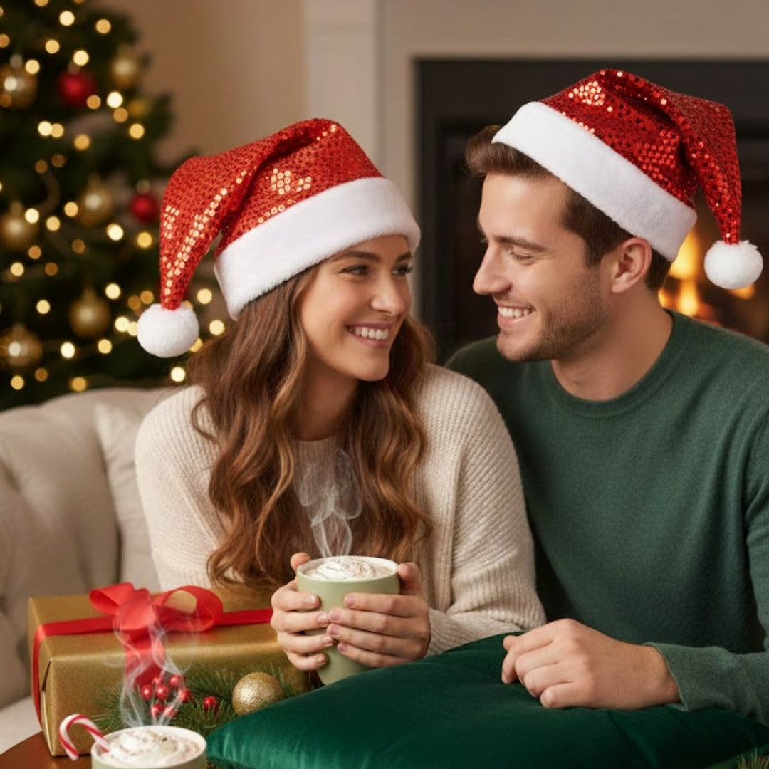 Wanna Party Red Santa Sequin Hat With Plush Ball & Plush Border, Sequin Santa Hat For Christmas, X-mas Party Hat for Adults, Santa Claus Caps