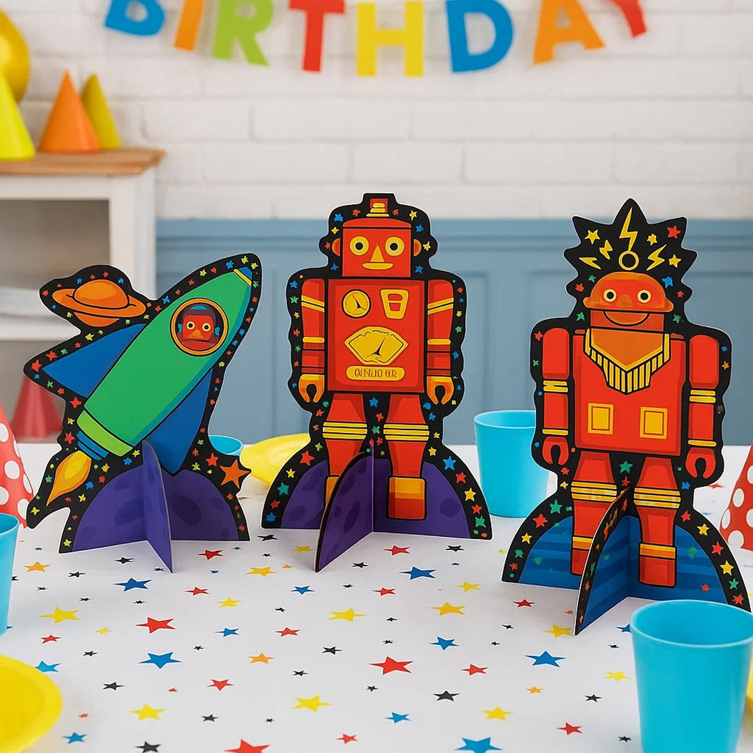 Pairs Perfectly with Other Robot Decorations: The PARTY BOTS CENTERPIECE is great on its own, but it also fits well with other robot-themed decorations. Match it with banners, cups, or balloons to create a complete look. It adds depth to your setup and ties the theme together in a simple, playful way.