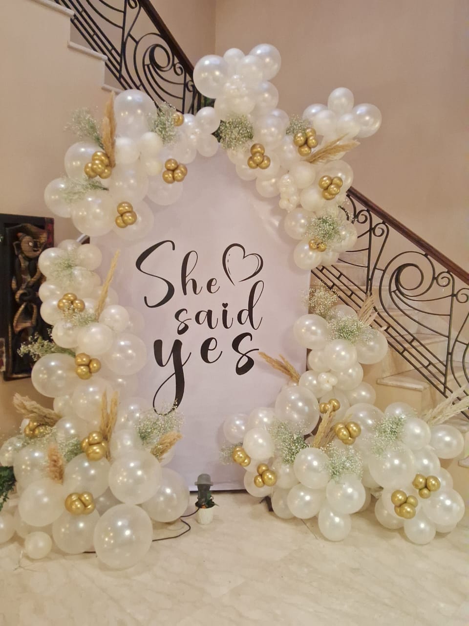 1) This set up includes a U U-shaped frame with balloons wrapped all around in the color of your choice with a customised print on it with Gypsum flowers.