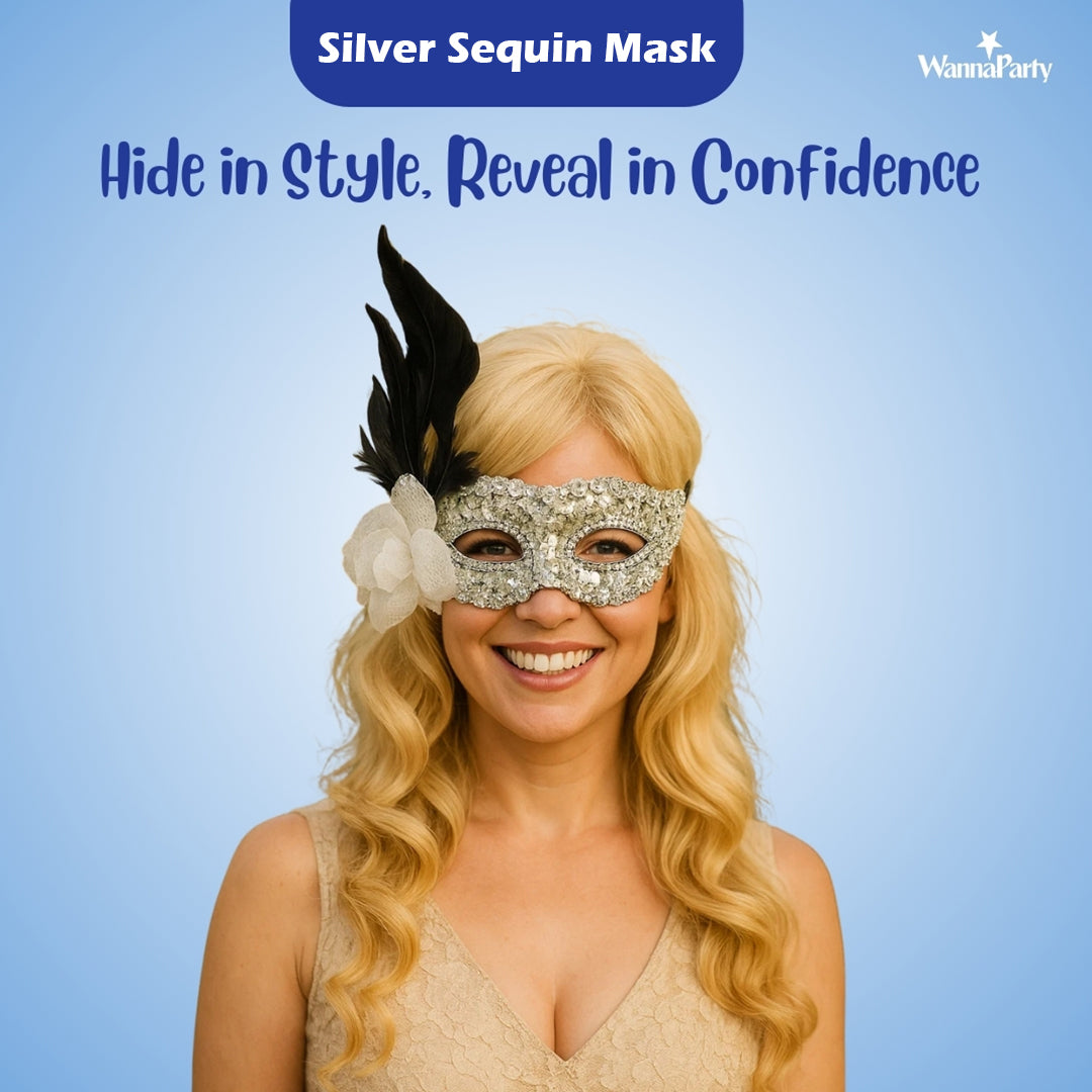 Wanna Party Women's Silver Sequin Eye Mask with White Flower for Masquerade Party, Fancy Dress Costume, New Year Party