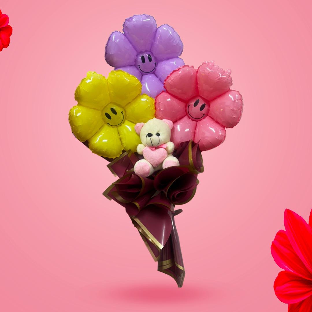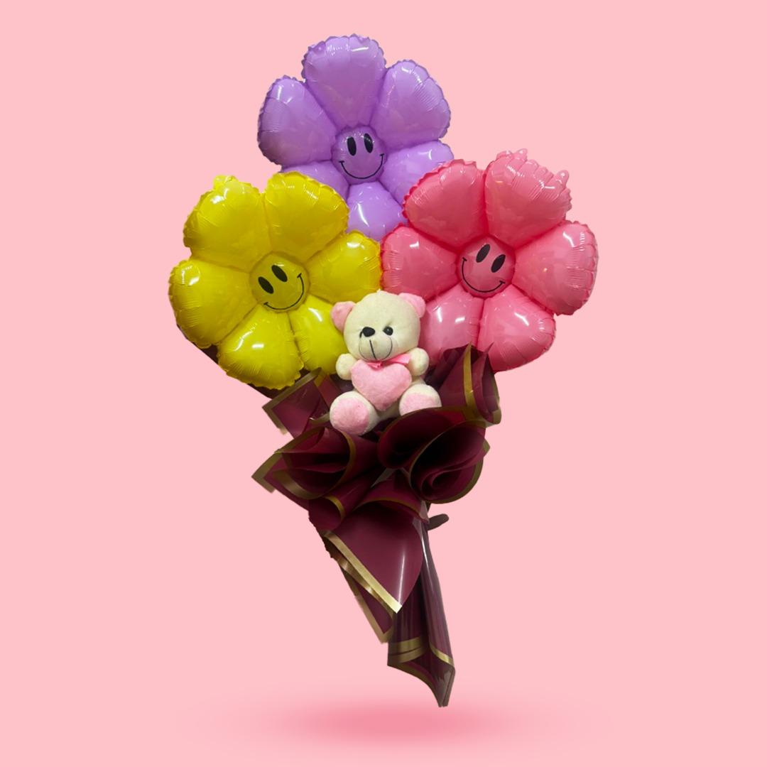 Smiling Flower Foil Balloon Bouquet w/Teddy Bear - 3PC