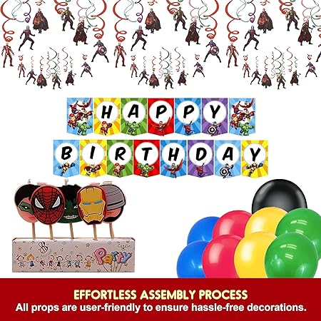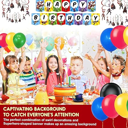 EXCEPTIONAL BACKGROUND: Create a stunning background in no time. This Superhero decoration combo includes a banner and several swirl decorations, which comes in handy to decorate the background without any fuss.