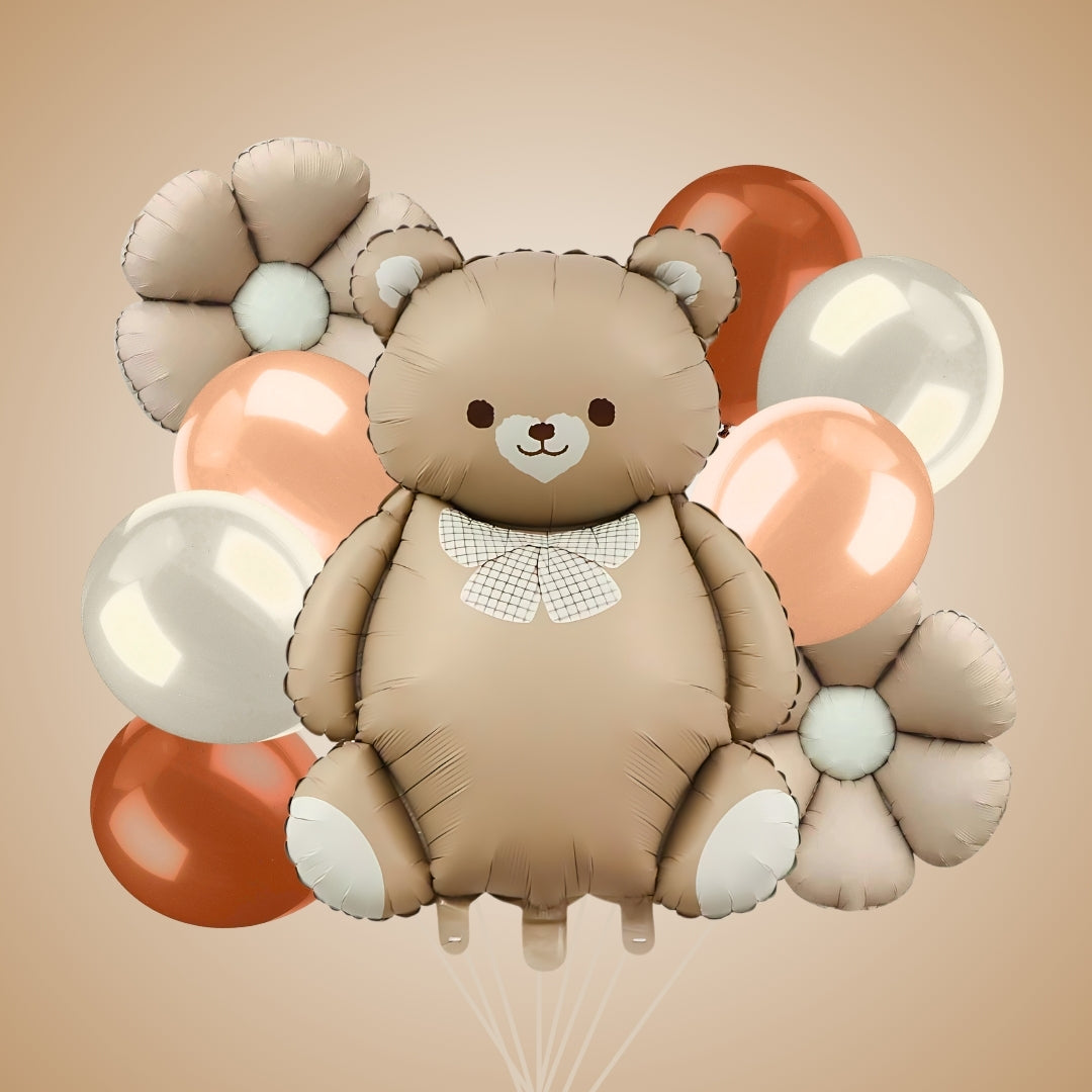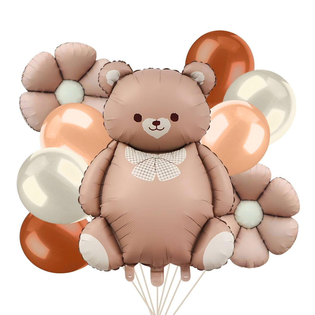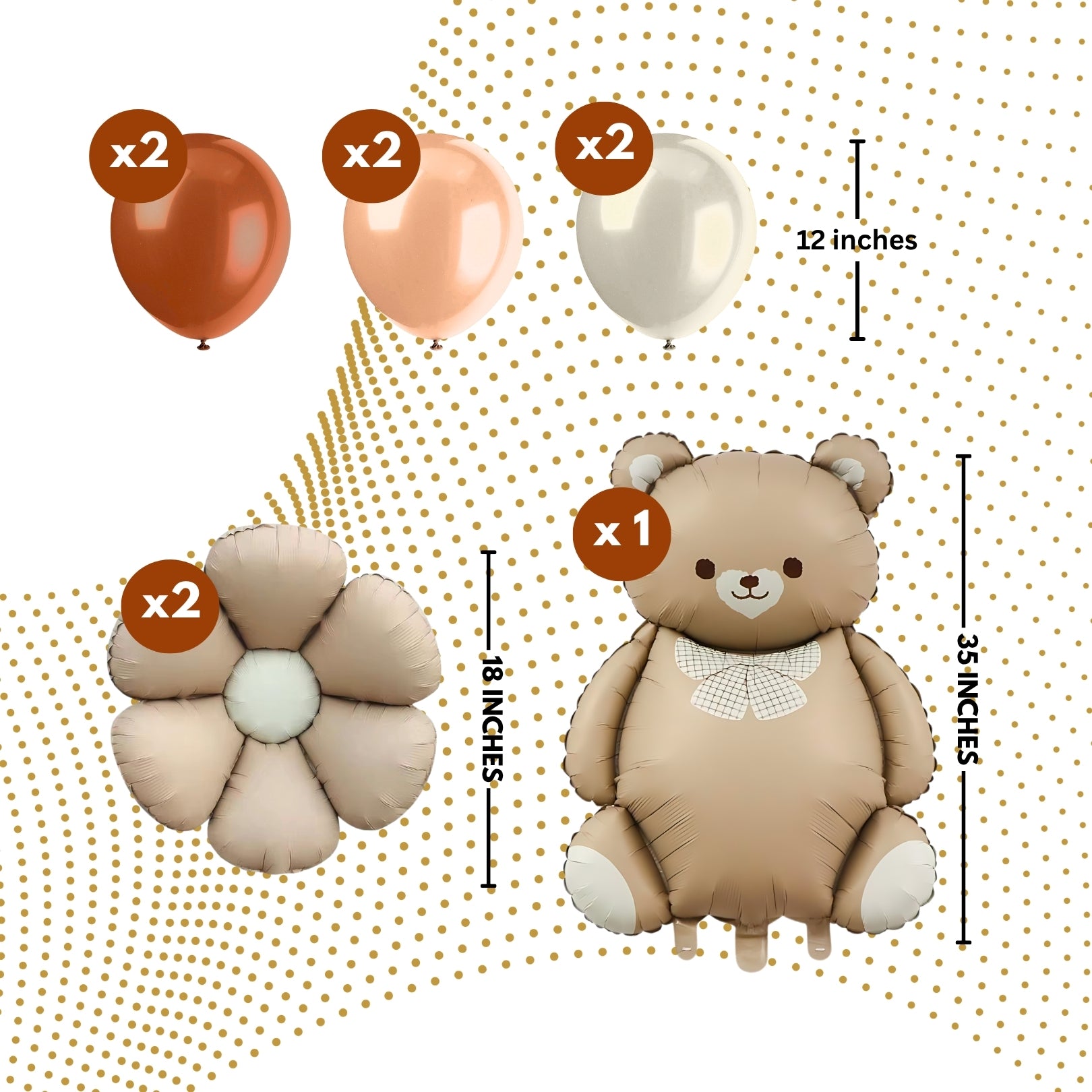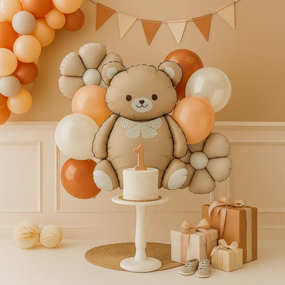 Charming Flower Foil Balloons: Includes two pastel-Matte brown flower shaped foil balloons that add a cute and elegant floral accent, perfectly complementing the teddy bear for a soft, themed look.
