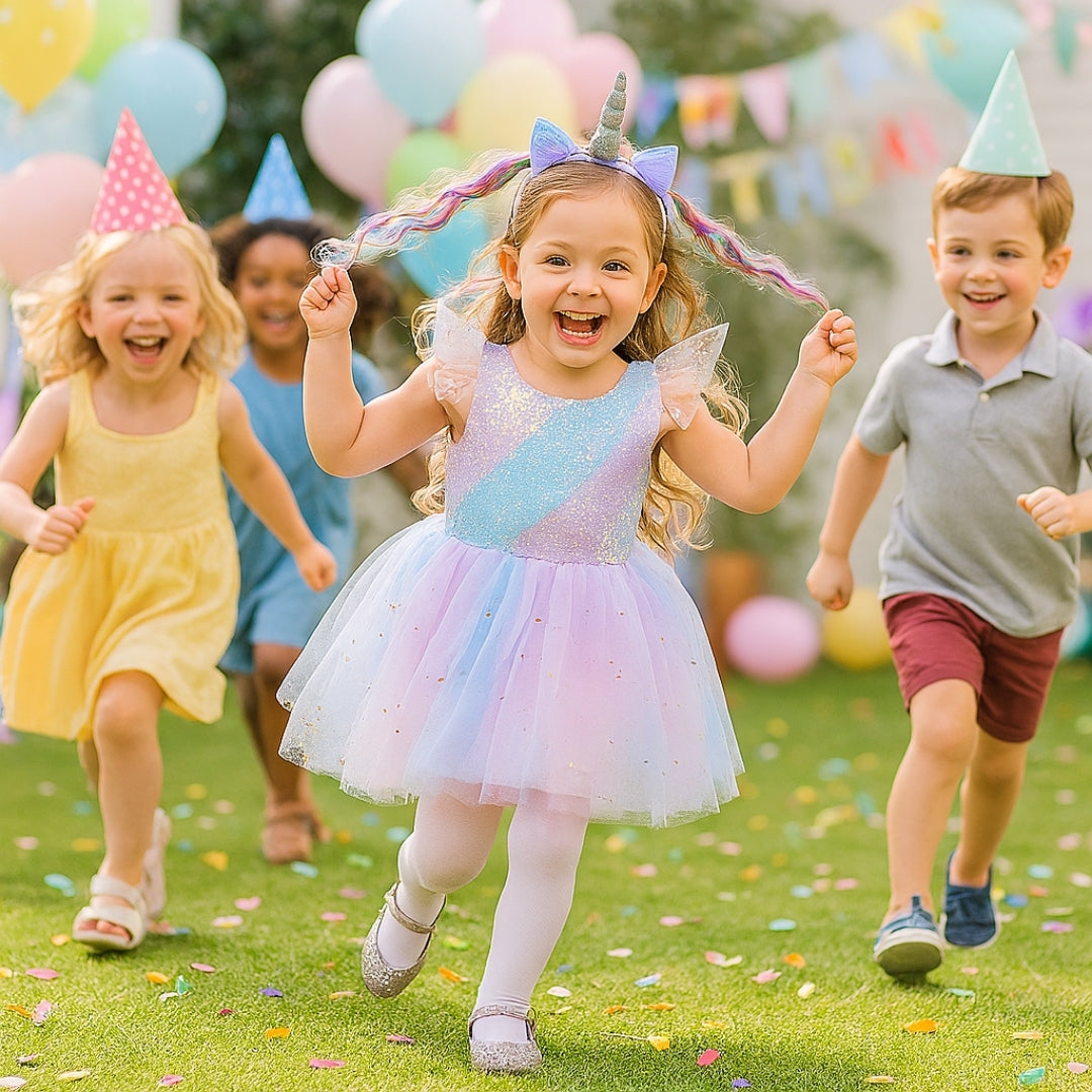 Magical Shimmer Design: This adorable unicorn costume features a dazzling pastel rainbow dress adorned with shimmering sequins, layers of soft tulle, and delicate glitter details that sparkle with every twirl — perfect for birthdays, Halloween, or imaginative dress-up play.