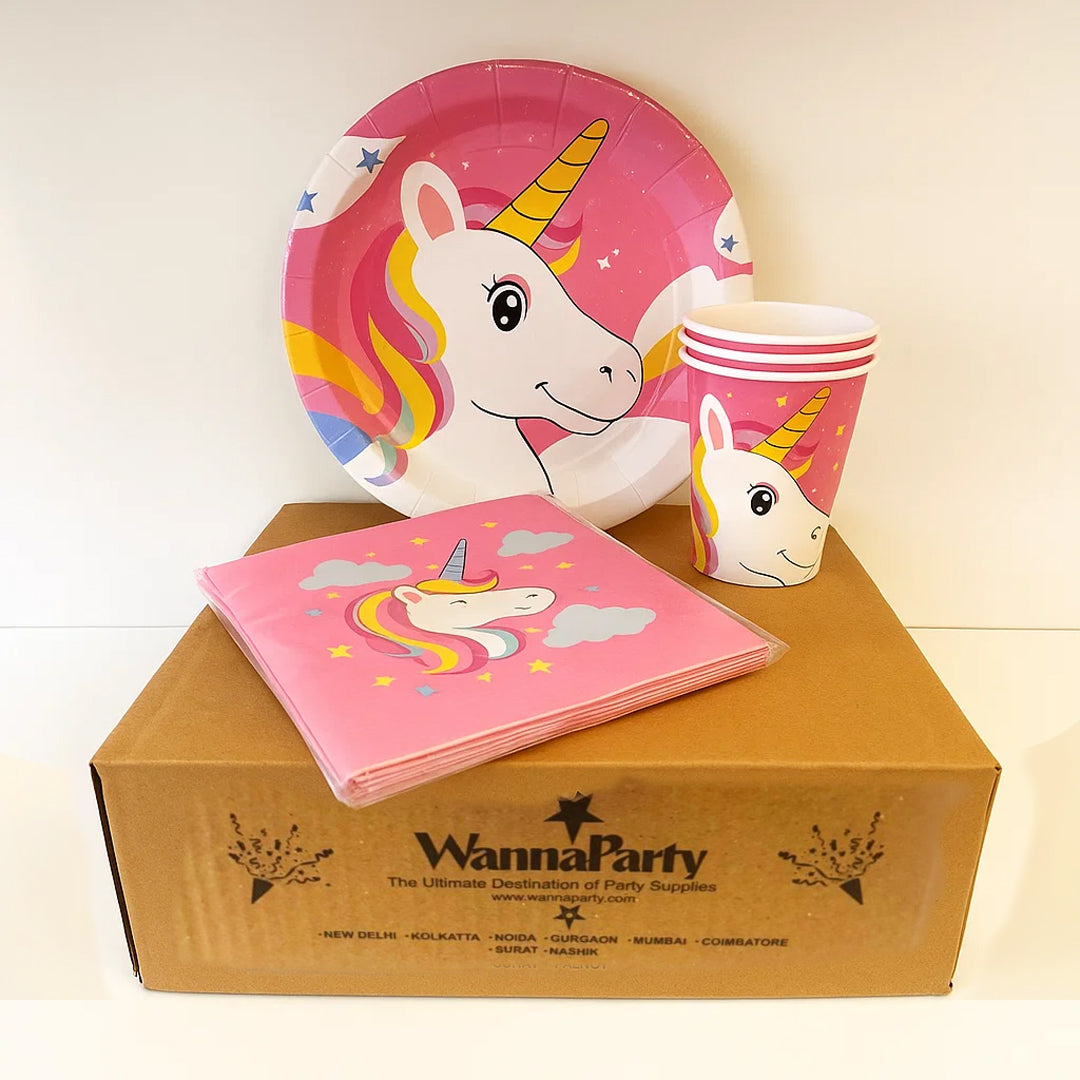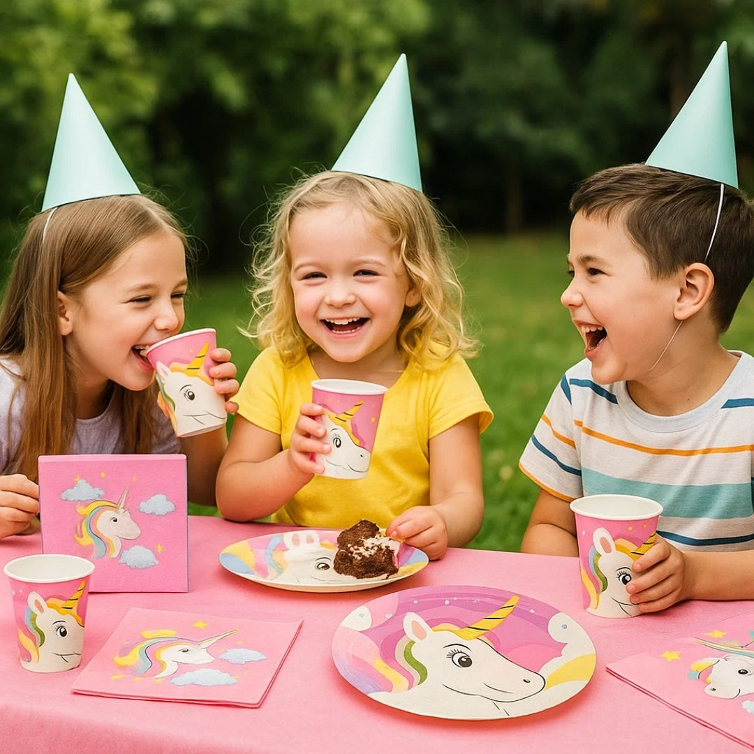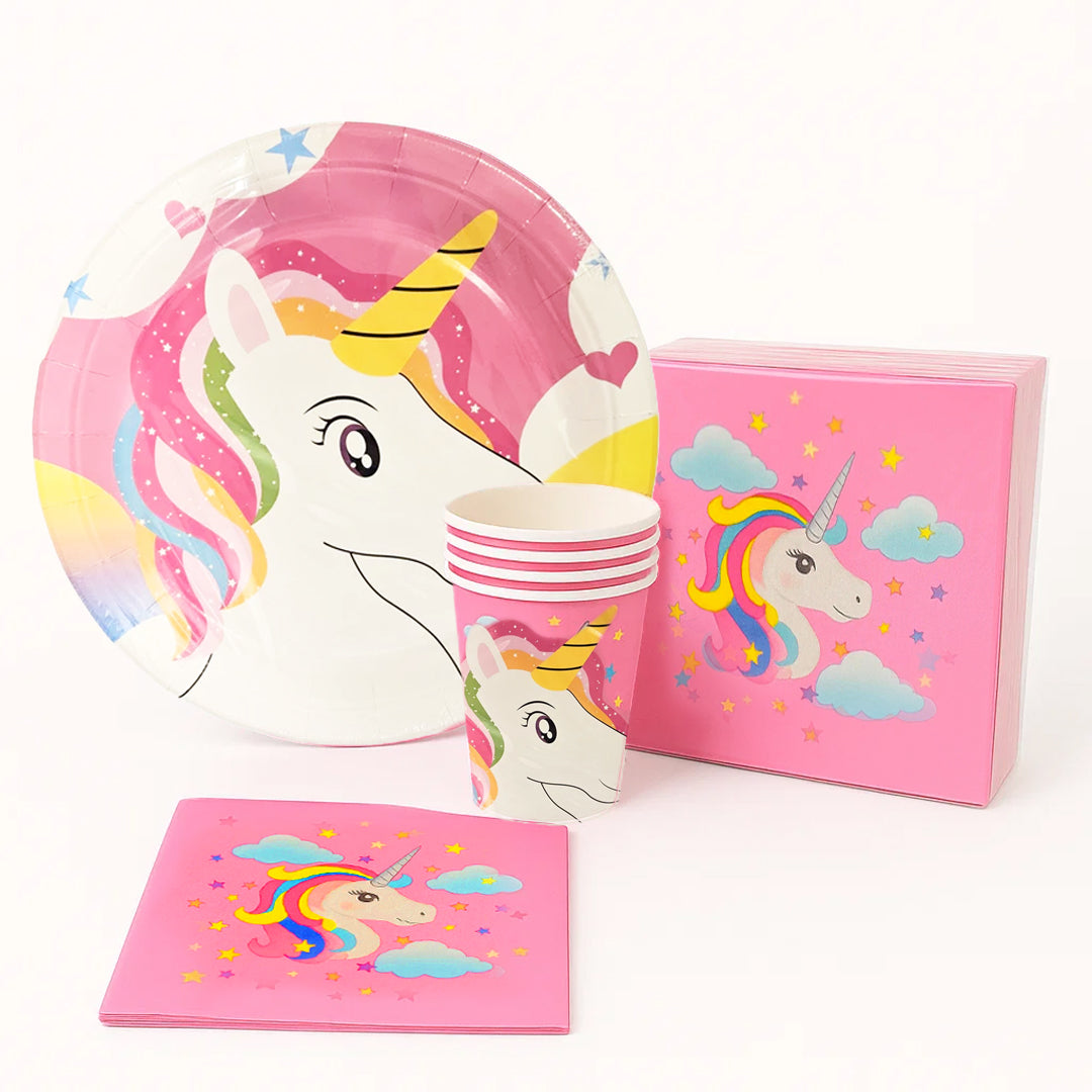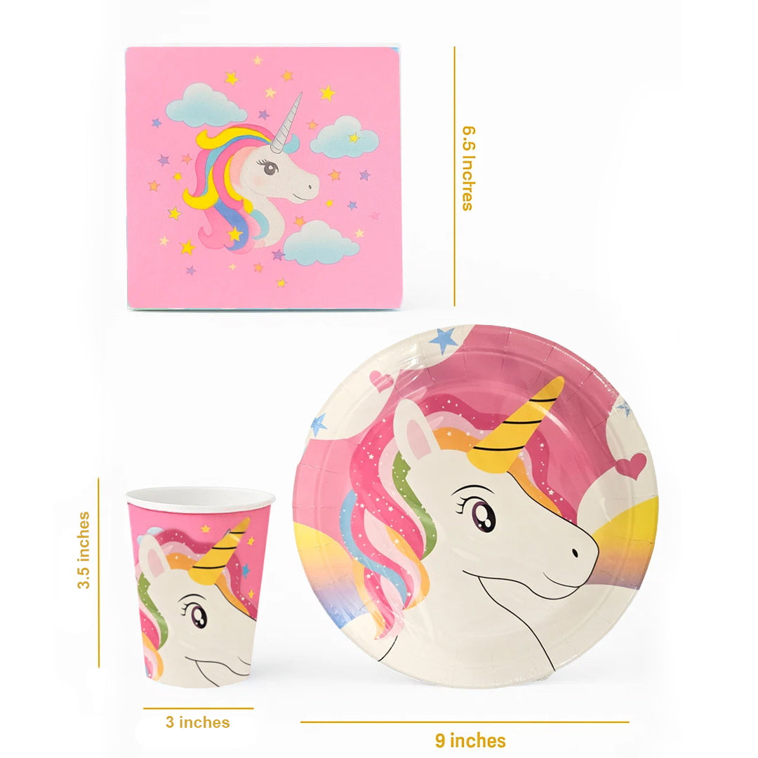 🎨 Adorable Unicorn Design: Each item features a charming and colorful unicorn print with rainbows, stars, and pastel accents, sure to delight kids and add a magical touch to any birthday or celebration.