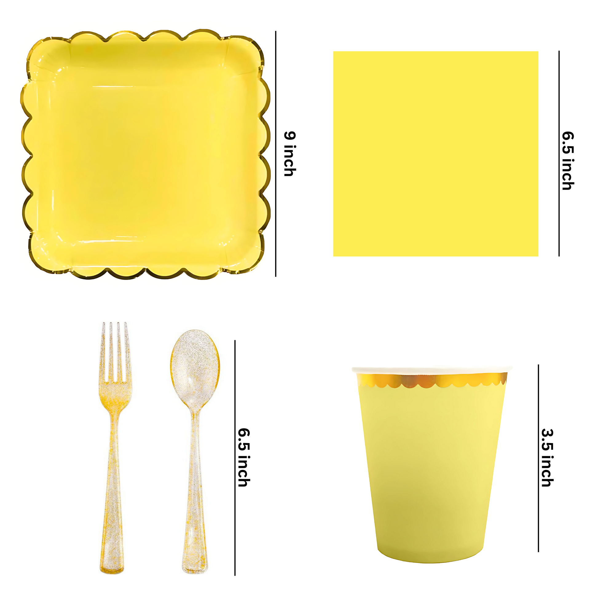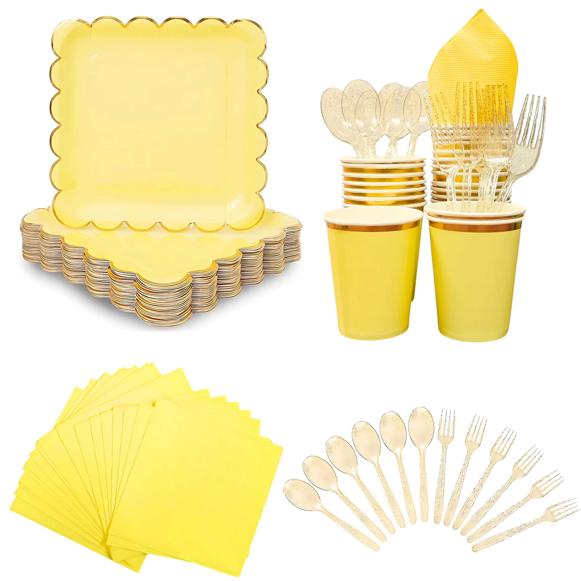 Yellow Party Tableware Combo with Plates, Tissues, Cups, Spoons and Forks - 64PC - Serves Upto 10 Pax