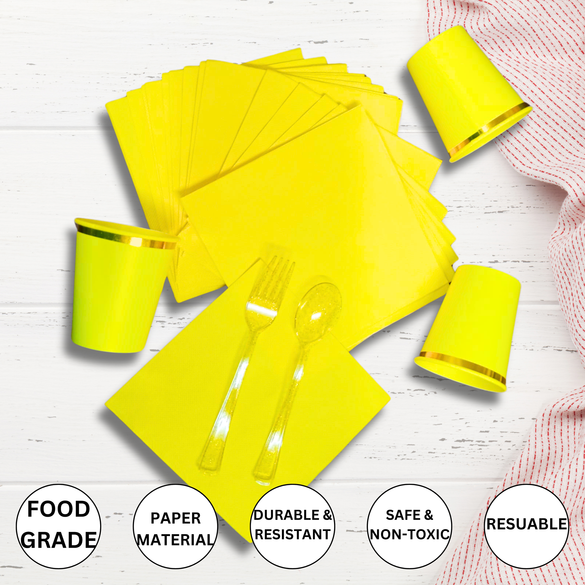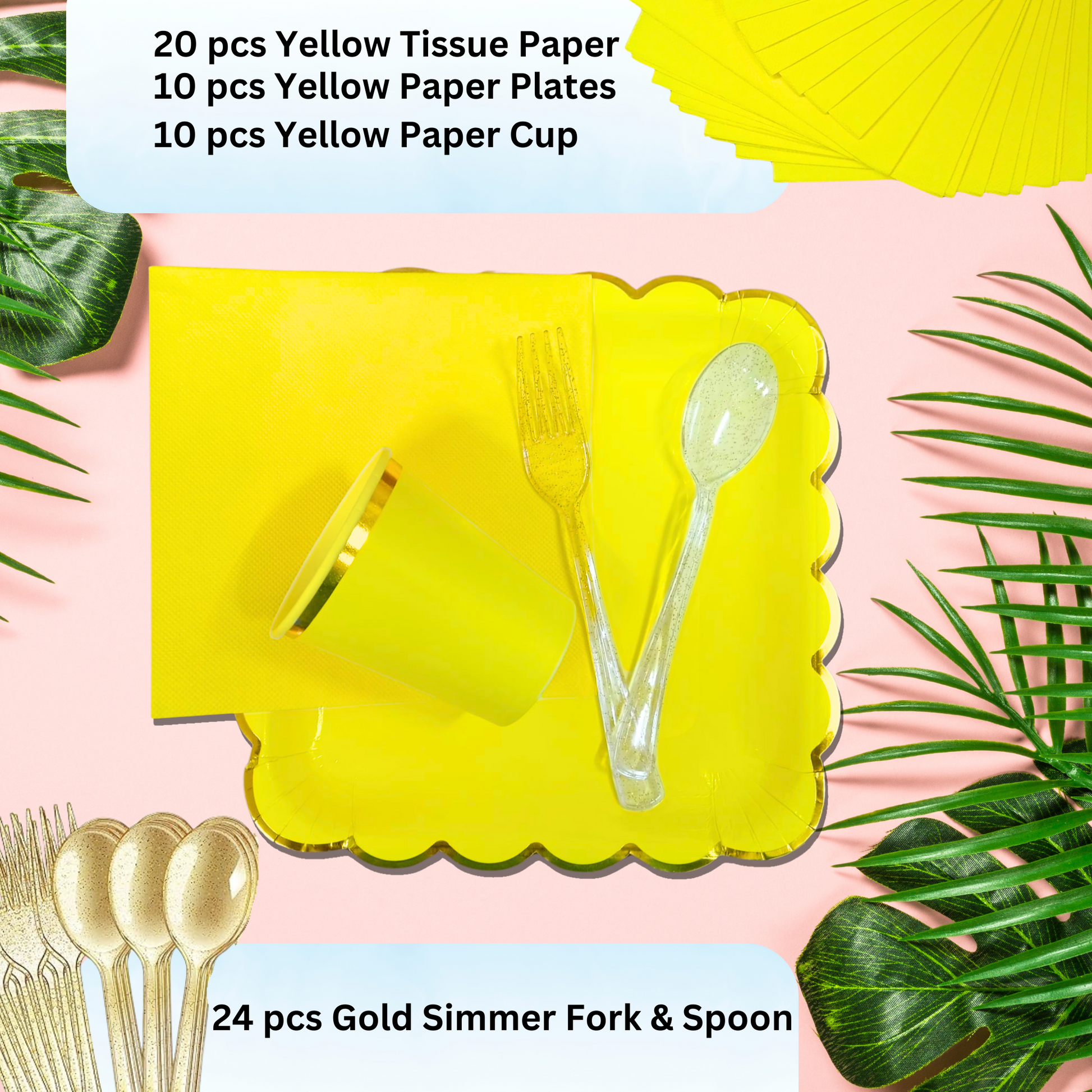 Complete Tableware Set: Includes 10 yellow plates with a gold outline, 10 yellow paper cups with gold lines, 12 gold shimmer forks, 12 gold shimmer spoons, and 20 plain yellow tissue papers, offering everything you need for a stylish party setup.