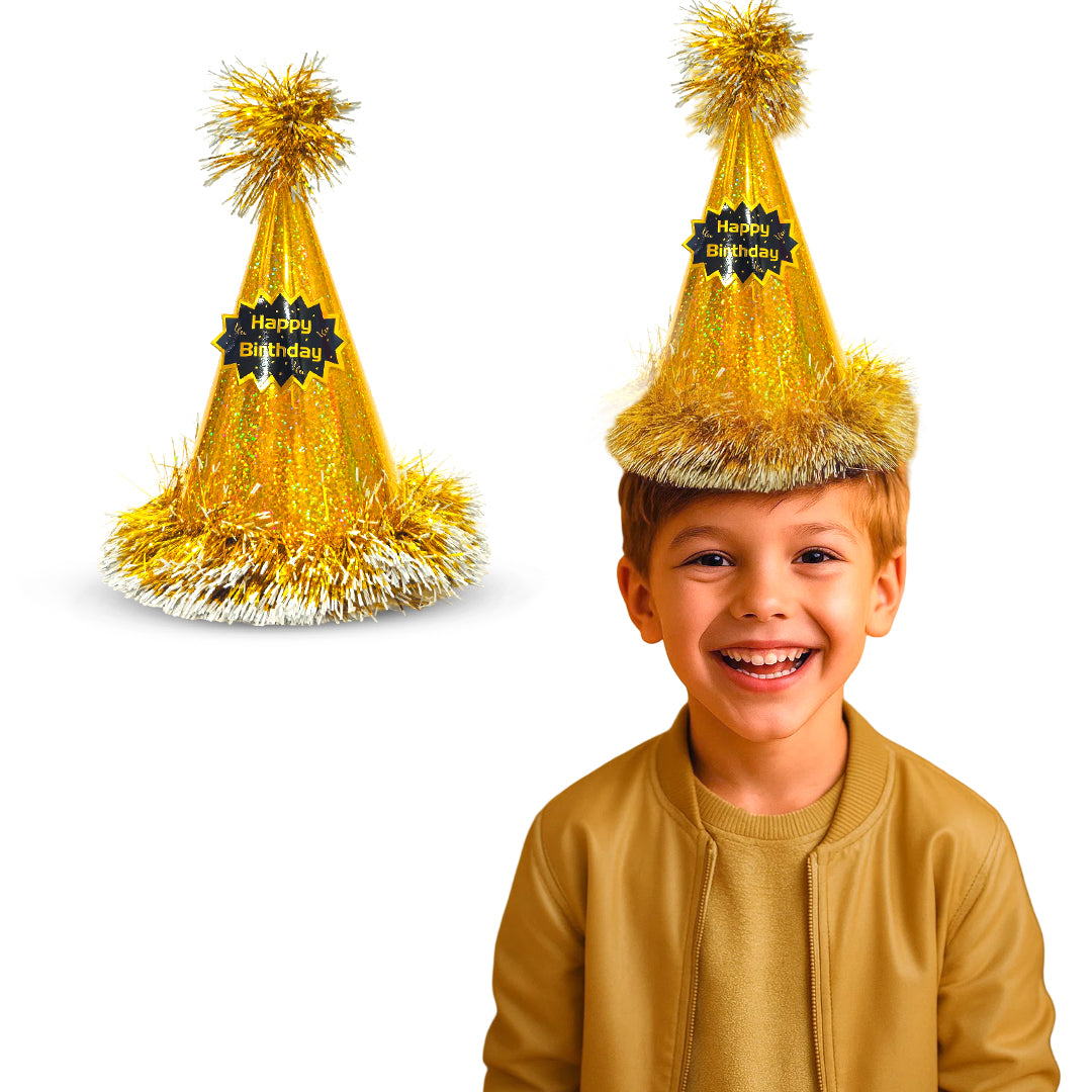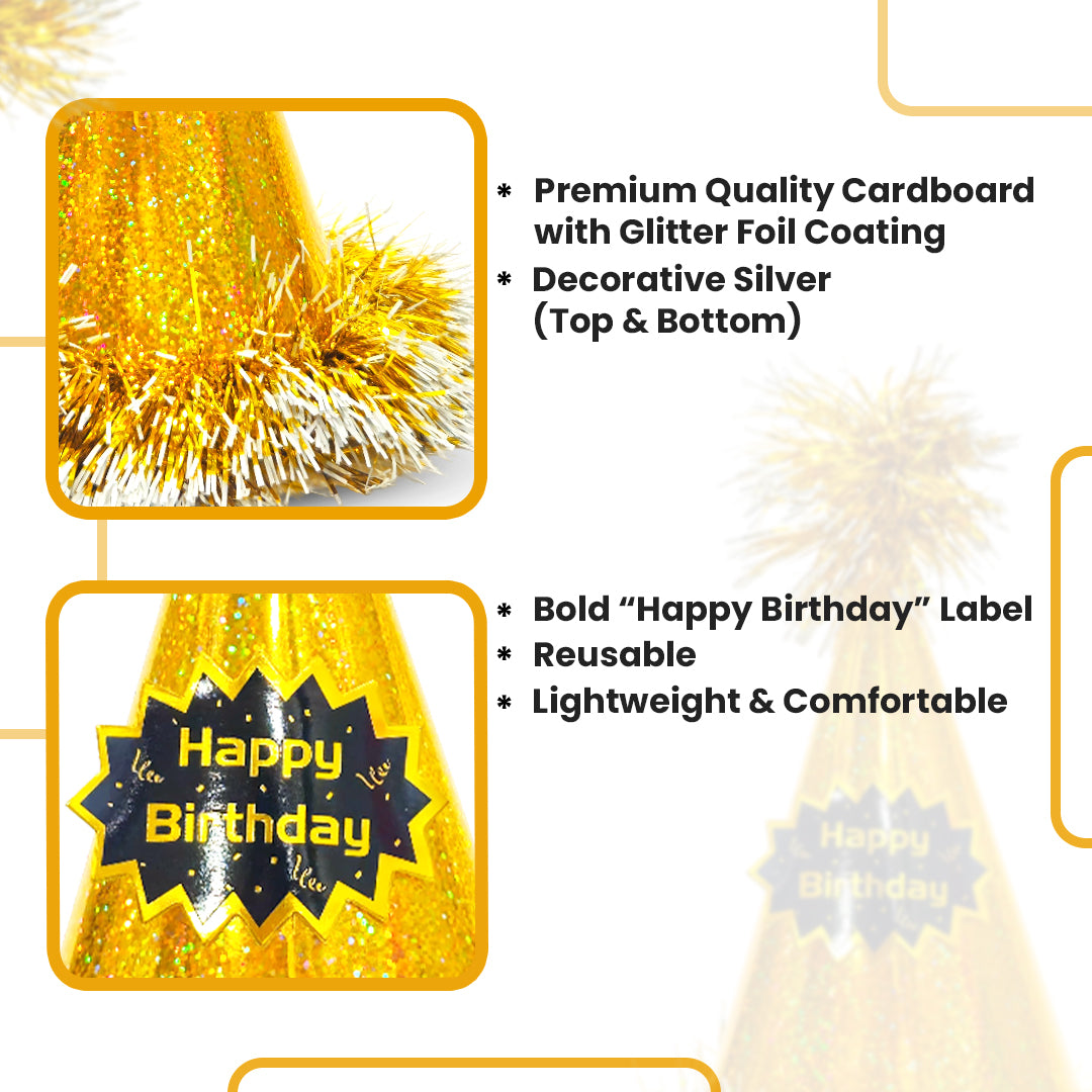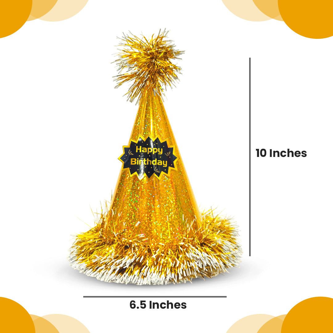 Elegant Golden Design: This conical birthday hat features a rich golden color with a stylish "Happy Birthday" print, adding a touch of sparkle and sophistication to any celebration.