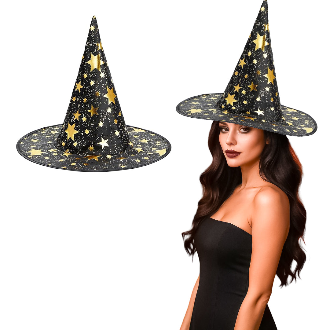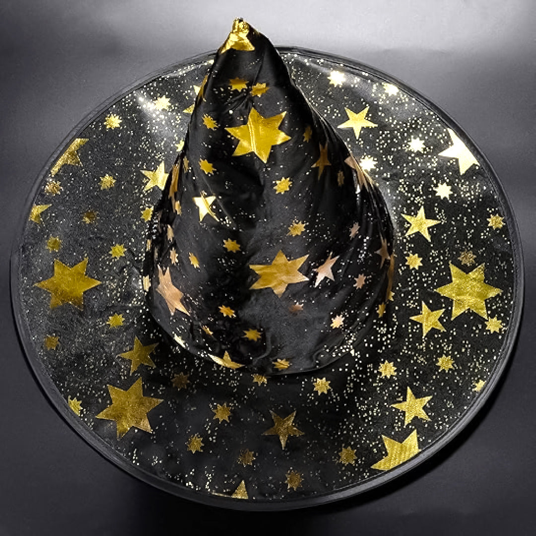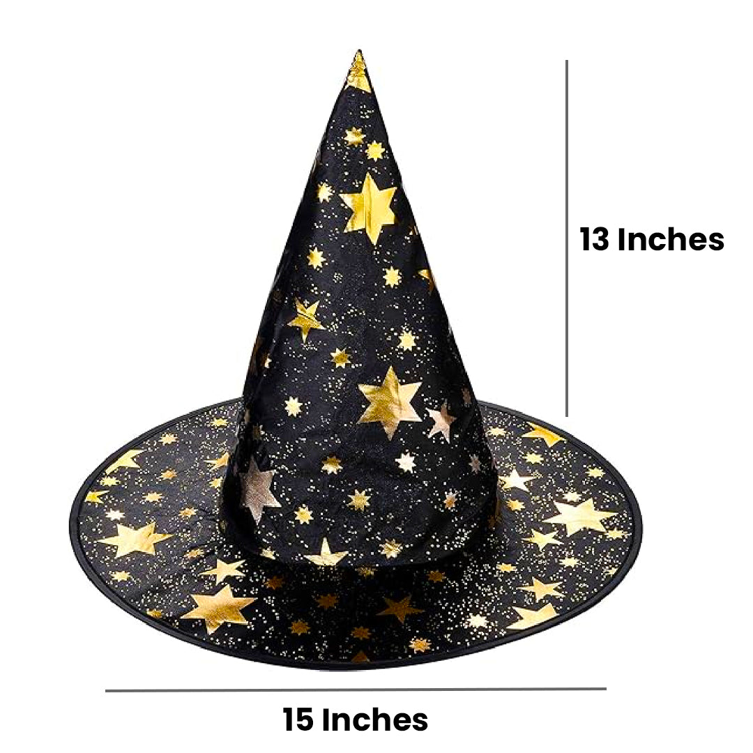 Elegant Black & Gold Design: This stylish witch hat features a sleek black base with shimmering gold foil stars, creating a magical and mystical look that’s perfect for Halloween, costume parties, and themed events.