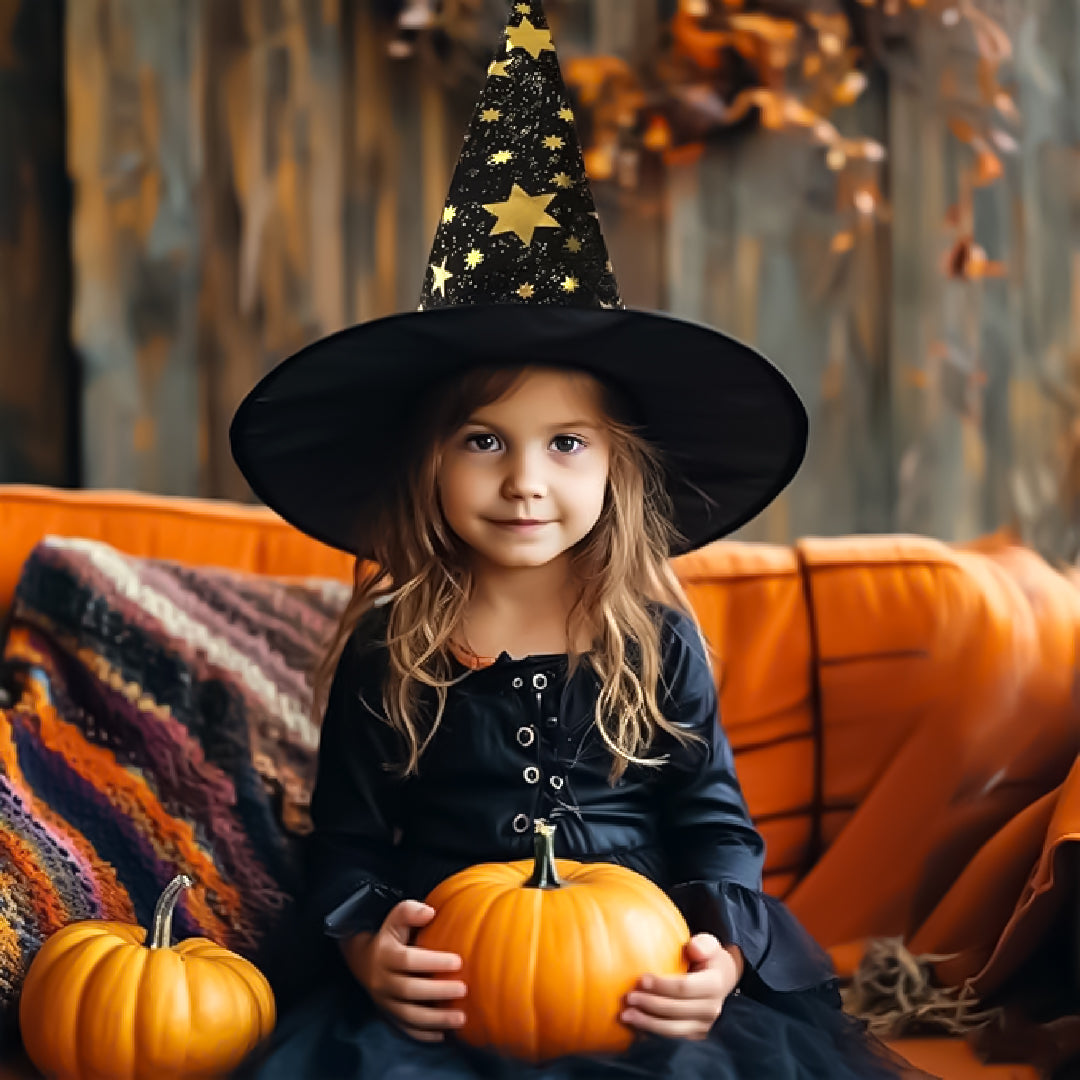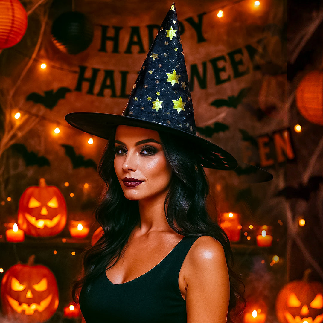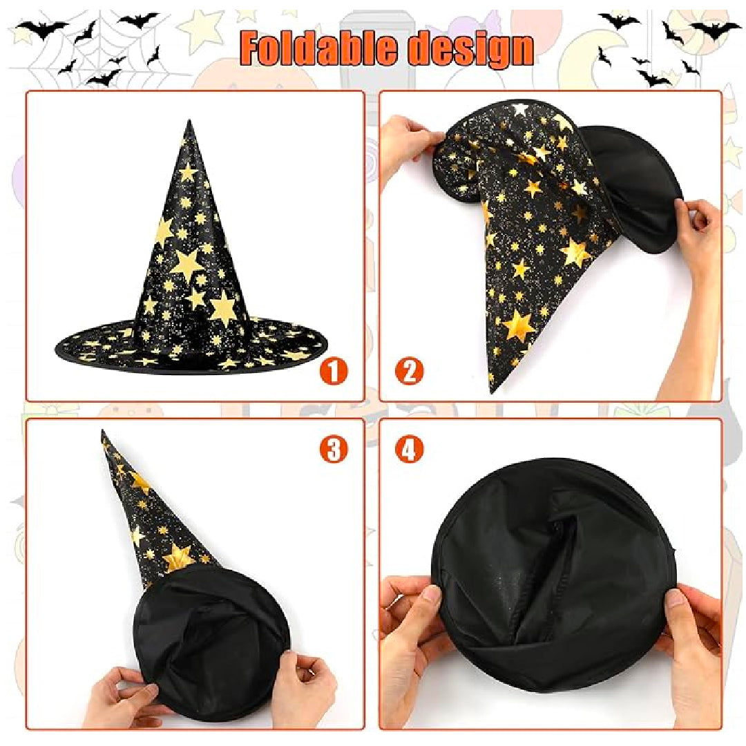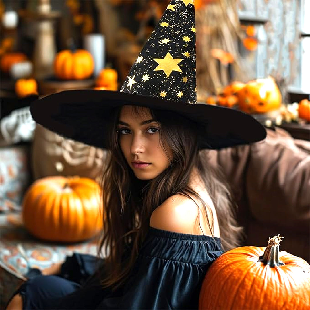 Elegant Black & Gold Design: This stylish witch hat features a sleek black base with shimmering gold foil stars, creating a magical and mystical look that’s perfect for Halloween, costume parties, and themed events.