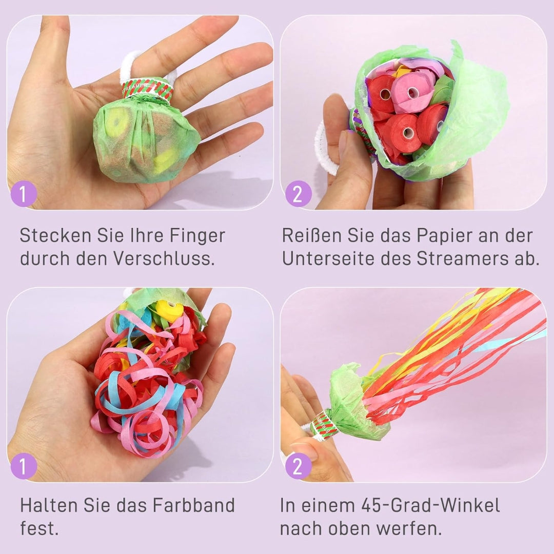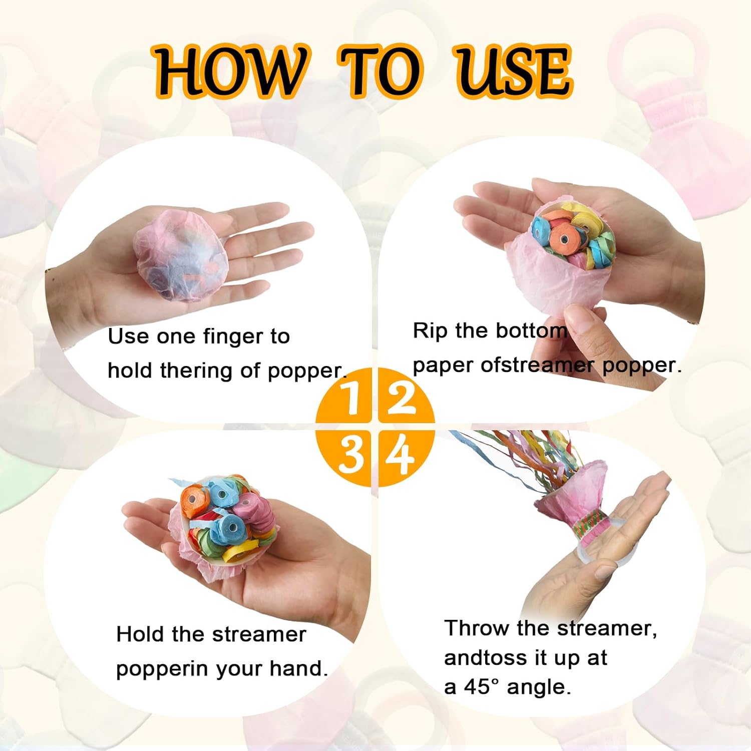 Safe & Easy to Use: Designed for all ages, each handheld streamer cannon is easy to operate—just twist and pop for an exciting burst of colorful streamers! The popper is made from lightweight, durable materials that are safe for all age groups and perfect for home parties, schools, and event venues. With no explosive elements or loose confetti, it's a parent-approved choice for children’s celebrations.