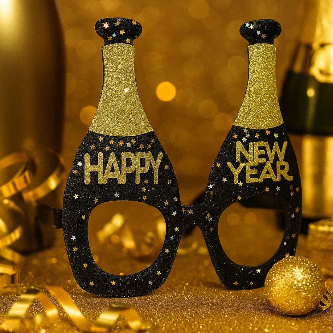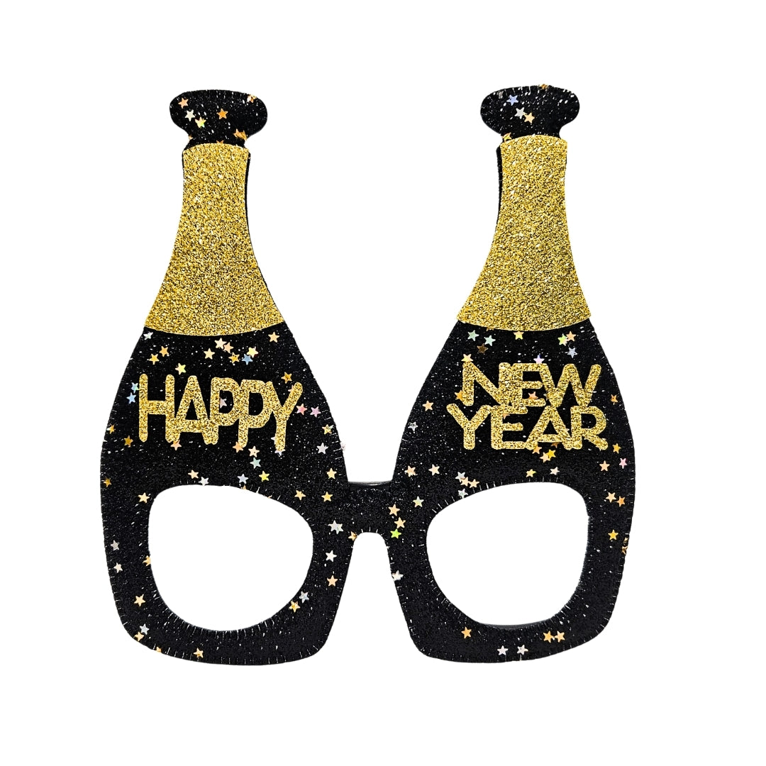 Stylish Celebration Accessory: Make a bold statement this New Year with our uniquely designed bottle-shaped party shades. Featuring a sleek black frame with shimmering golden "Happy" and "New Year" text on bottles each side, these shades instantly add fun and flair to any celebration.